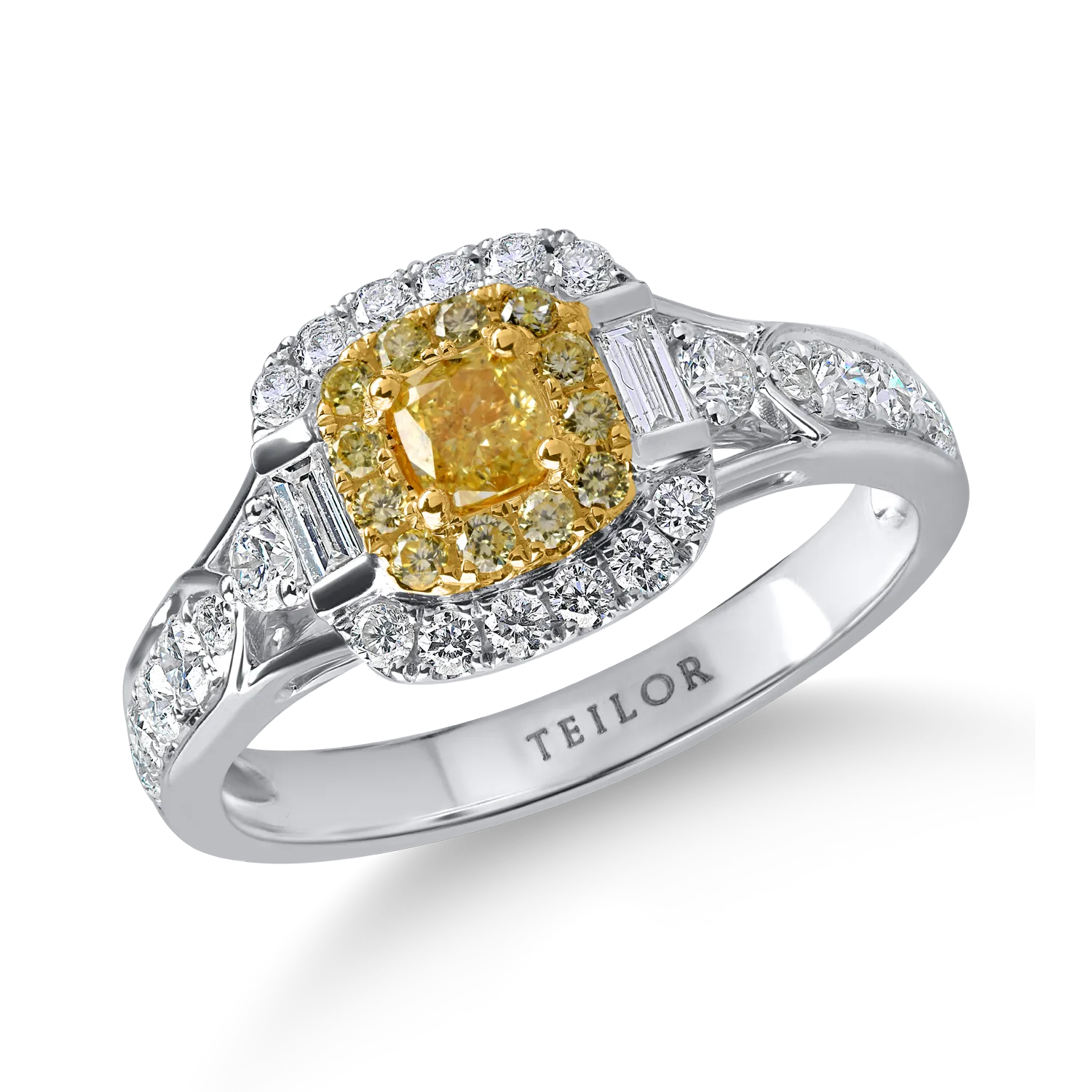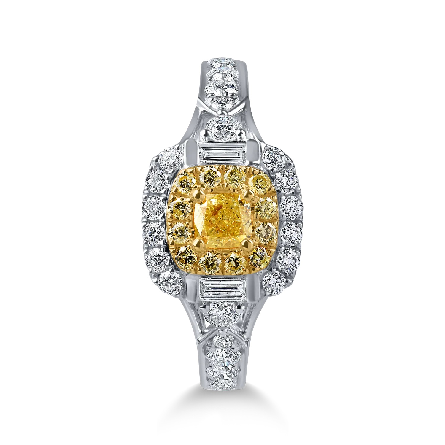 Inel clasic din aur alb-galben cu diamante galbene cushion si rotunde si diamante incolore baguette si rotunde de 1.6ct