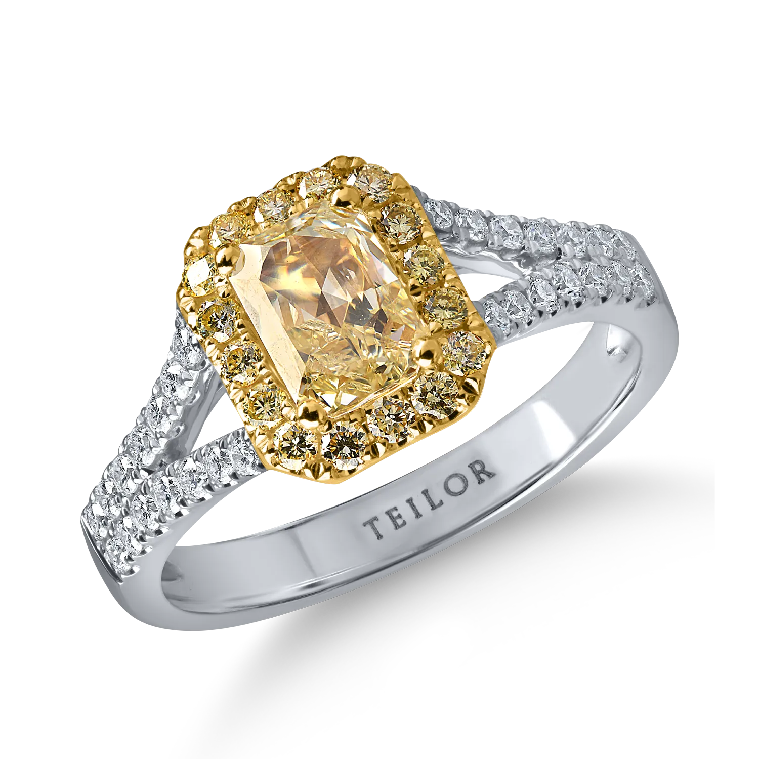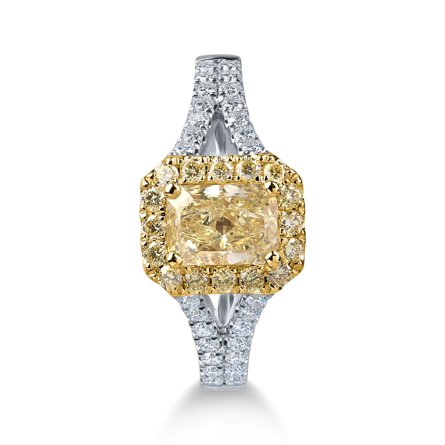 Inel clasic din aur alb-galben cu diamante galbene rectangulare si rotunde si incolore de 1.5ct