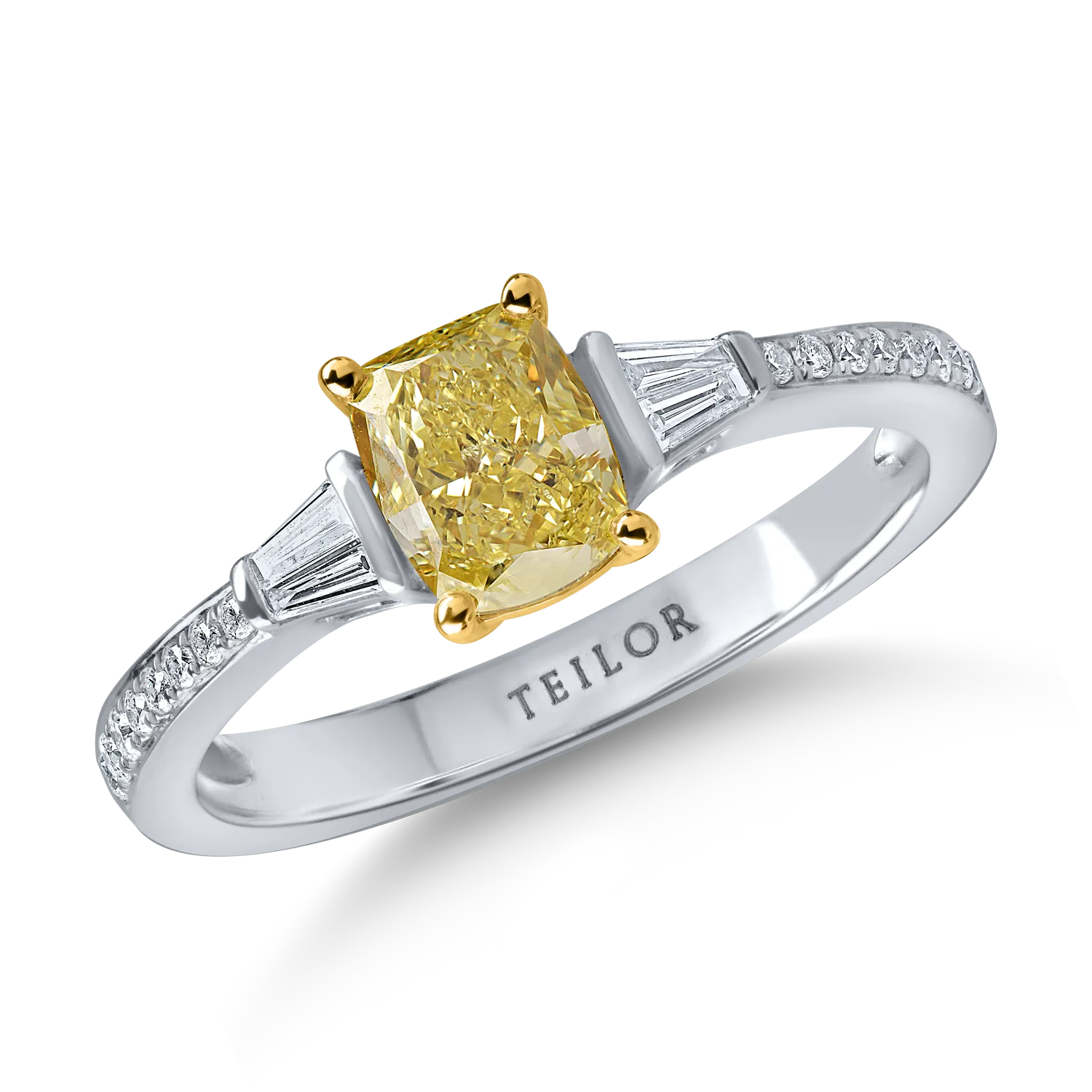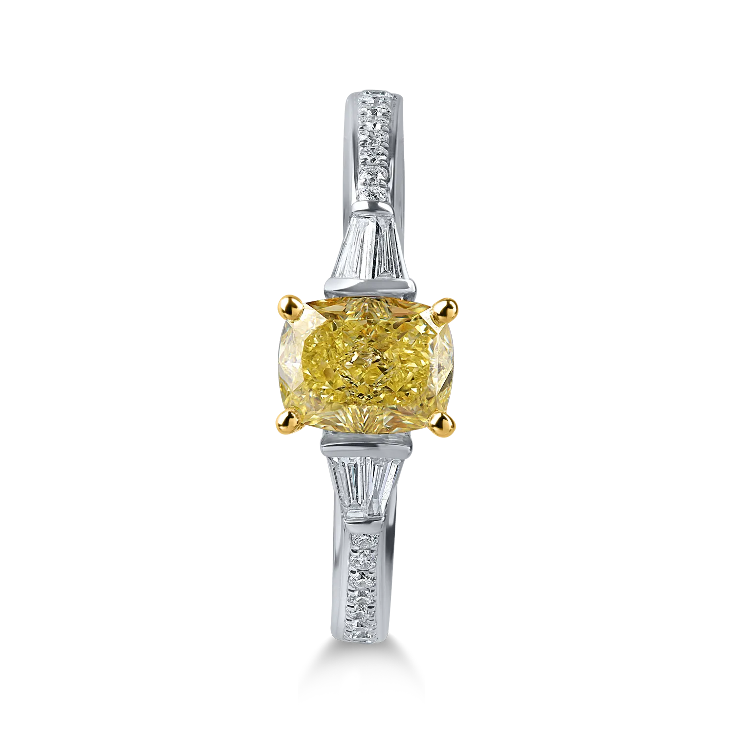 Inel clasic din aur alb-galben cu un diamant fancy glaben cushion de 1ct si diamante incolore baguette si rotunde de 0.19ct