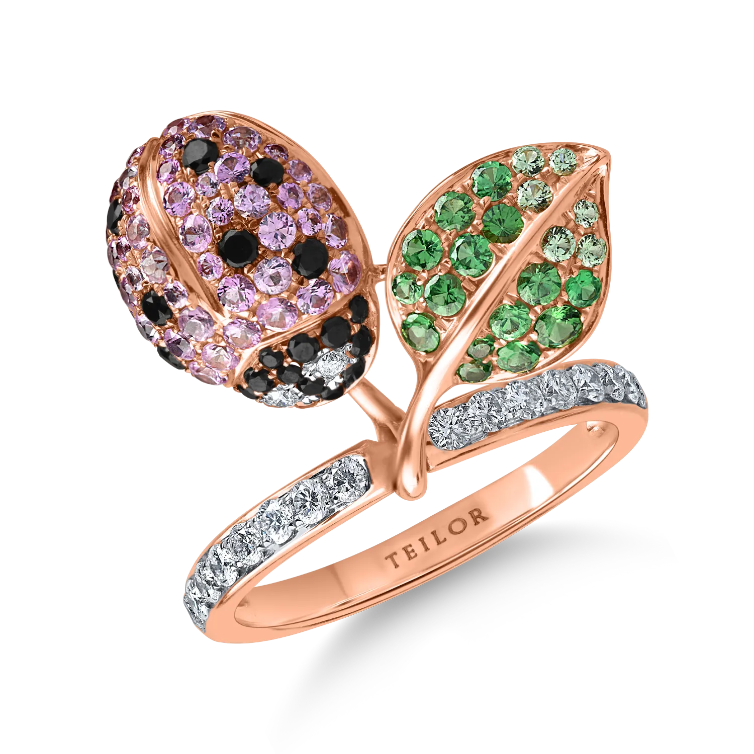 Stil si personalitate. Un inel cu buburuza din aur roz cu pietre pretioase de 1.6ct creat pentru a te pune in valoare si a-ti accentua farmecul natural. Cu linii fine si un design inovator, fiecare bijuterie TEILOR este o declaratie. Descopera-l pe cel care iti completeaza povestea!