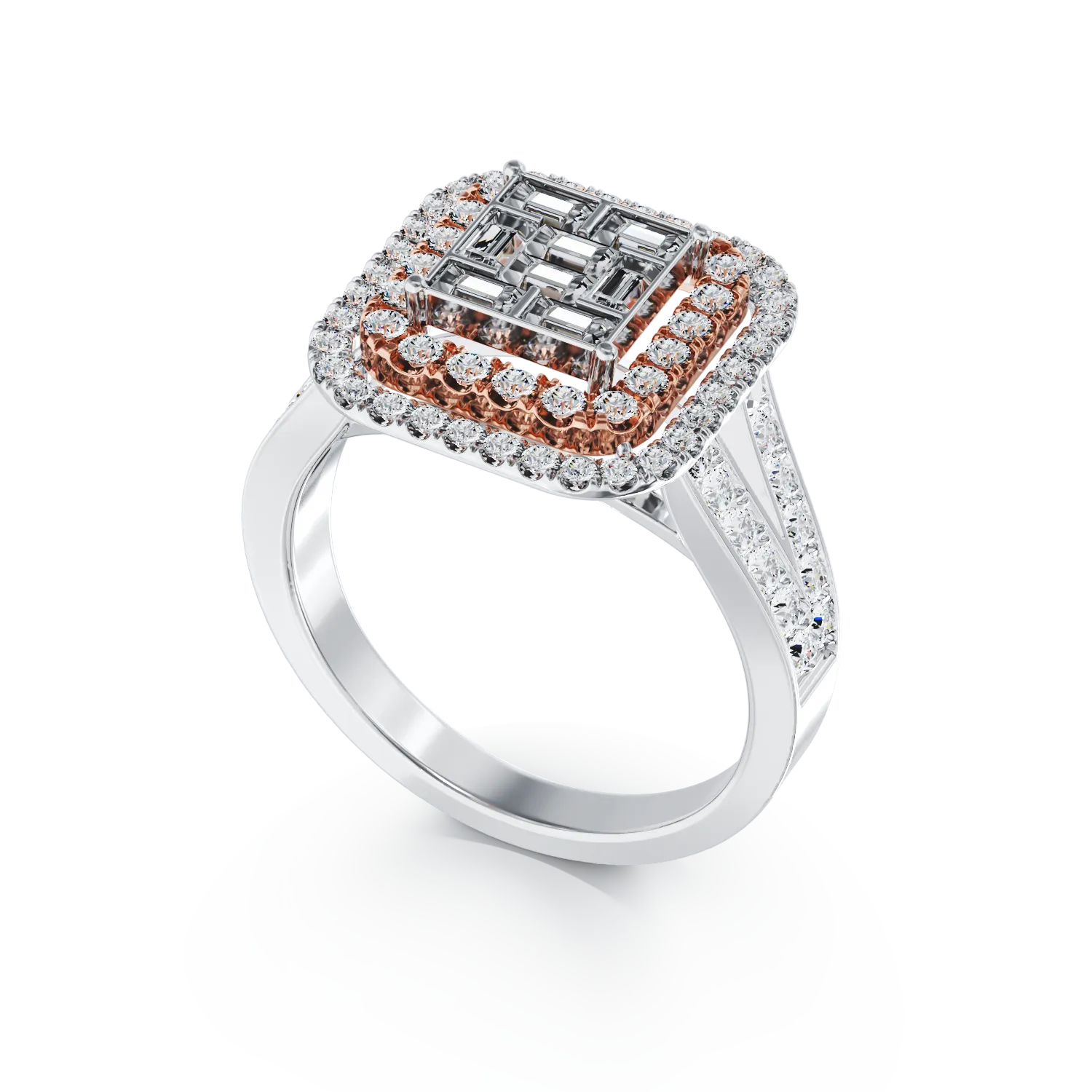 Inel de logodna din aur alb-roz cu diamante baguette si rotunde de 0.8ct