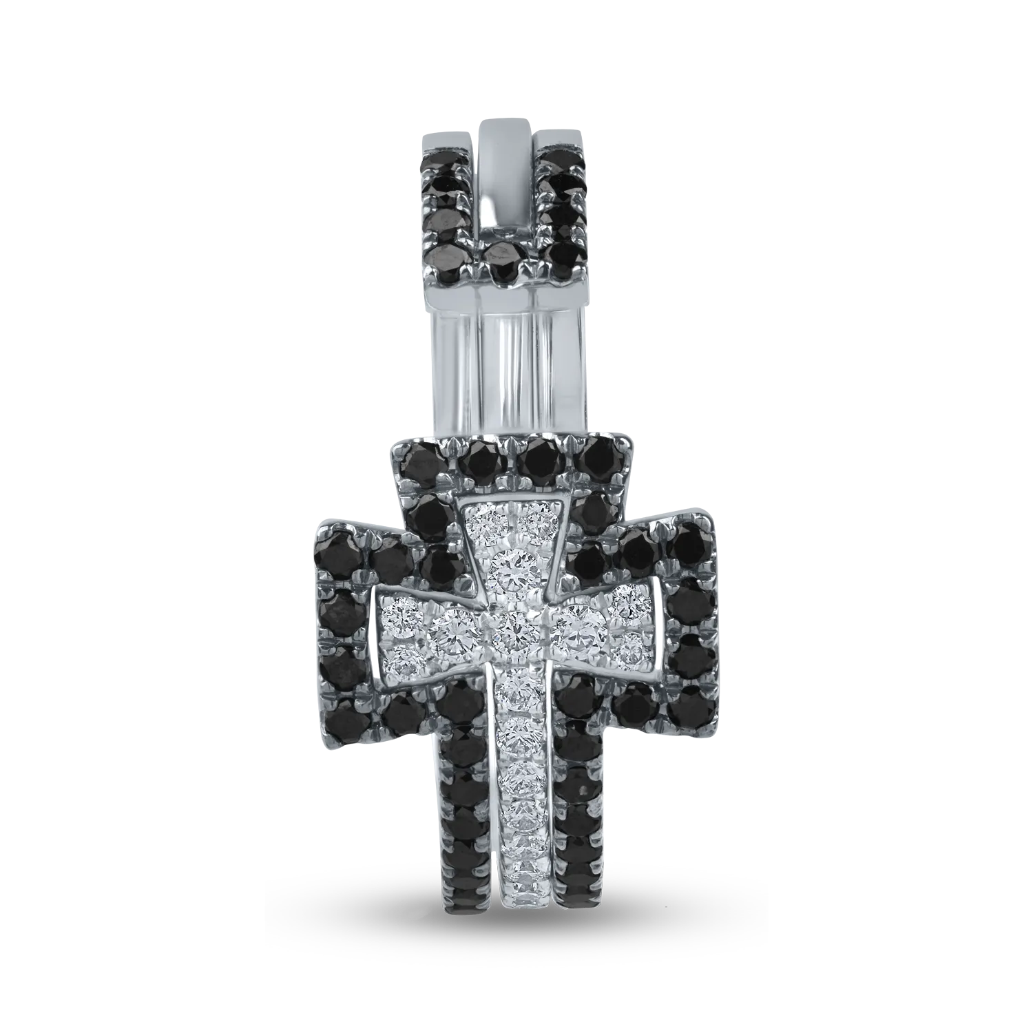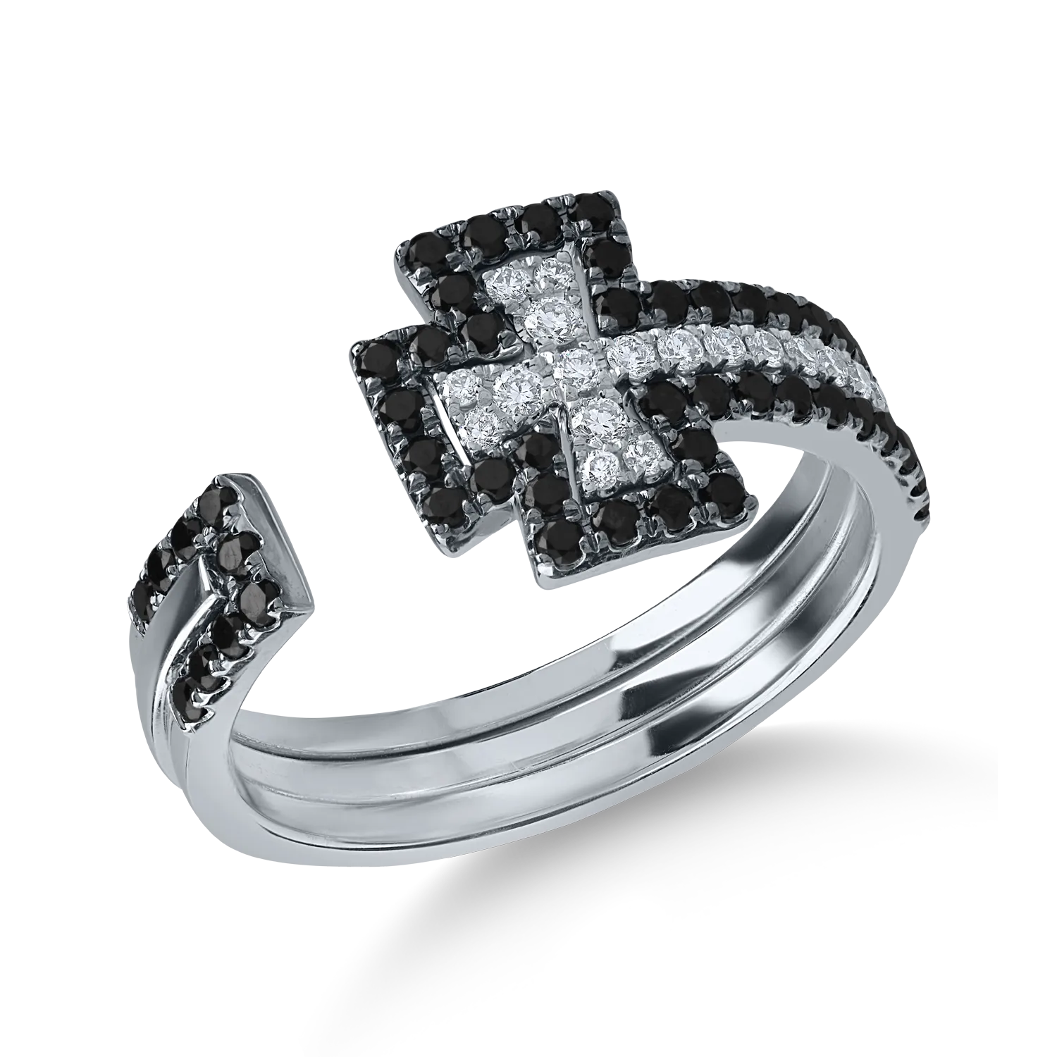 Inel deschis cu cruce din aur alb cu diamante negre de 0.3ct si diamante incolore de 0.1ct