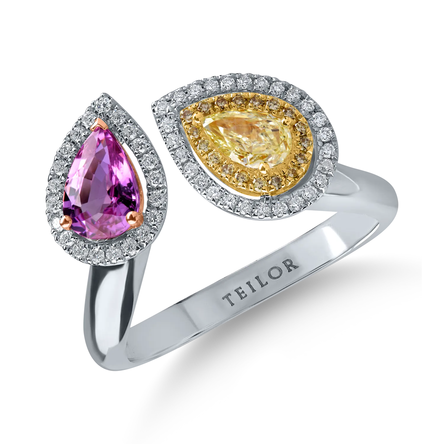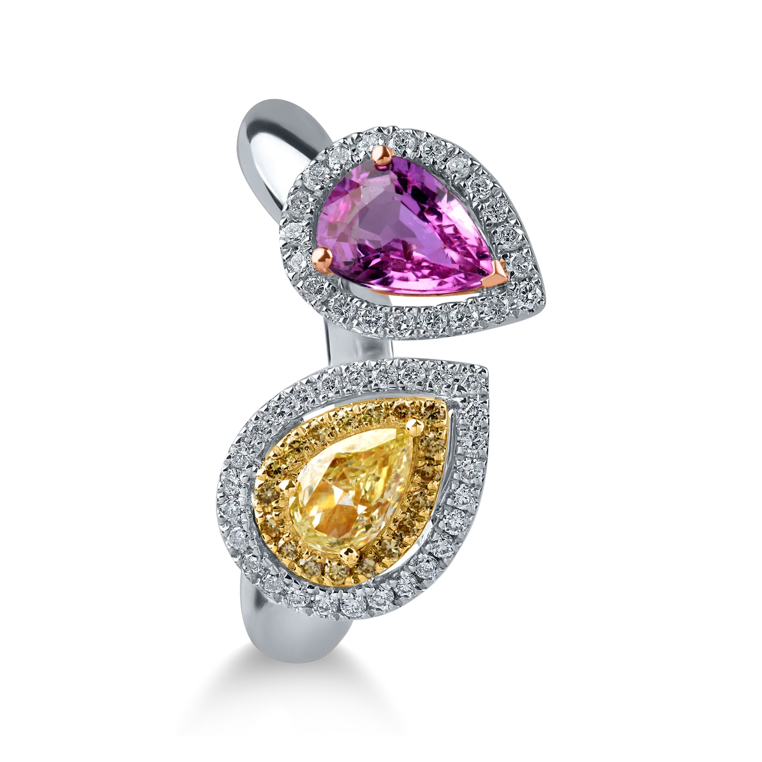 Inel deschis din aur alb cu diamant fancy galben pear de 0.3ct, safir roz de 0.8ct si diamante galbene si incolore de 0.1ct
