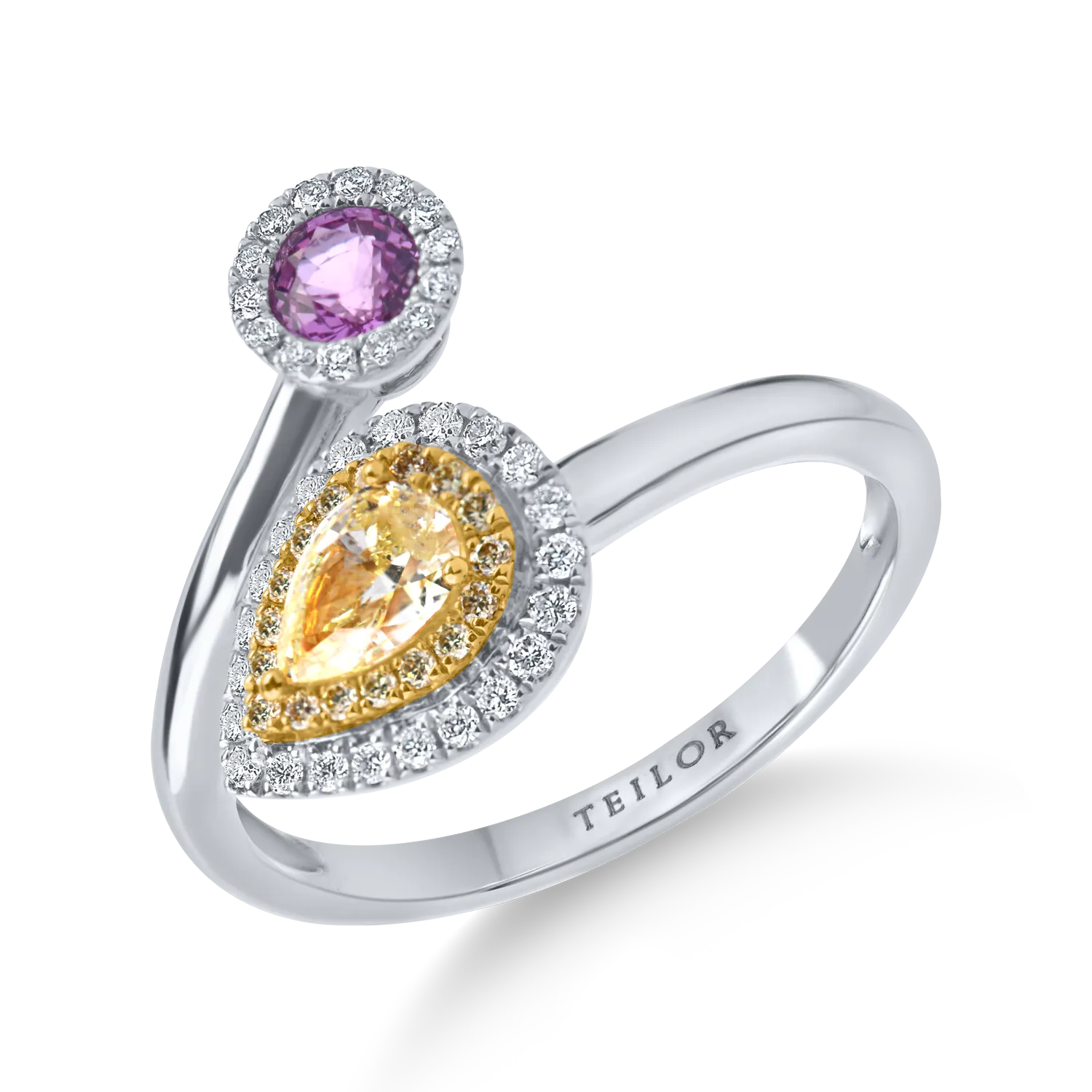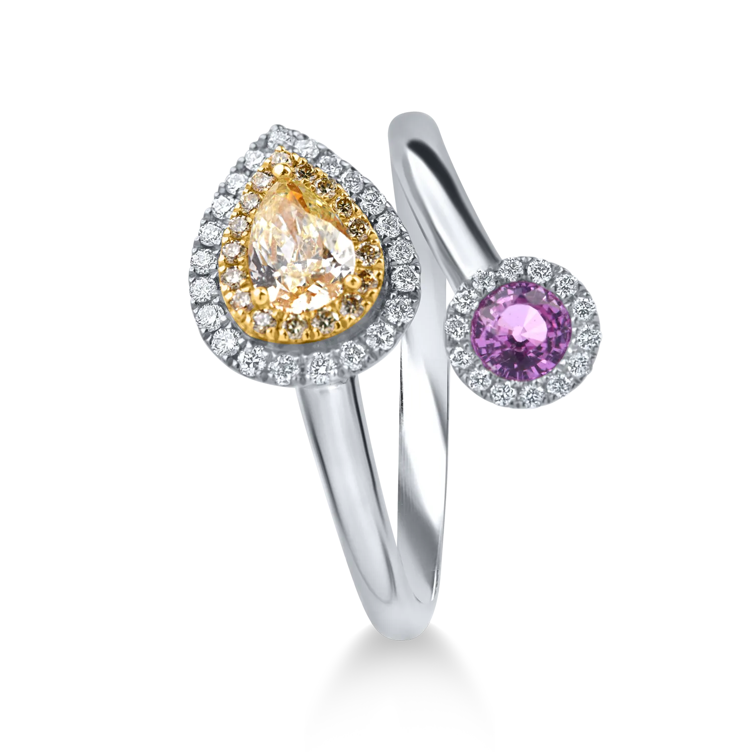Inel deschis din aur alb cu diamant fancy galben pear de 0.4ct, safir roz de 0.3ct si diamante galbene si incolore de 0.1ct