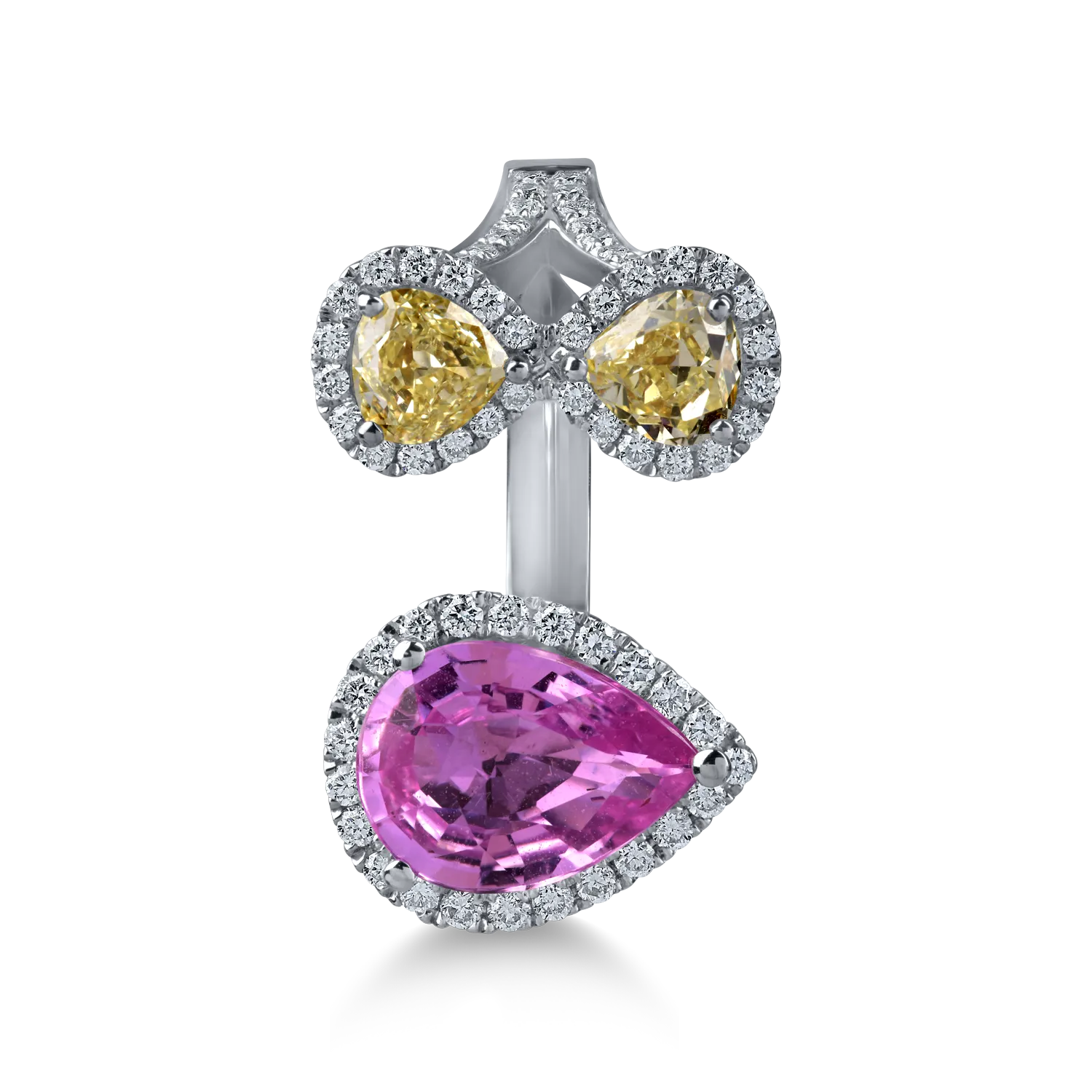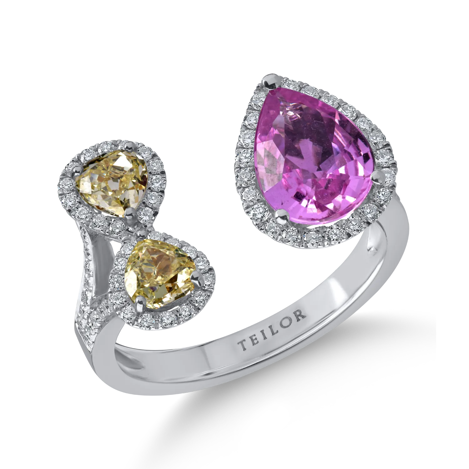 Inel deschis din aur alb cu safir roz pear si diamante galbene si incolore de 2.6ct