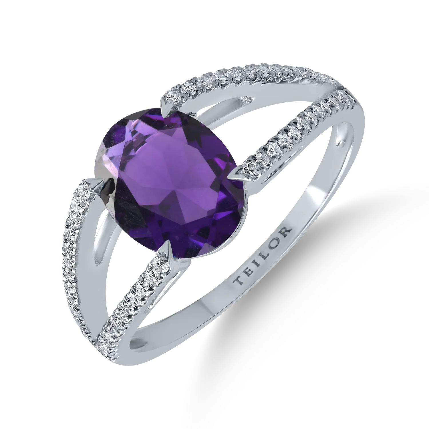 Feminitate si atitudine. Descopera acest inel din aur alb cu ametist cu taietura ovala de 1.3ct si diamante de 0.2ct, in care forma clasica intalneste un rafinament contemporan. Taietura ovala evidentiaza nuanta profunda a pietrei si creeaza o lumina moale, care urmeaza natural miscarile mainii. Este o bijuterie care transmite echilibru si feminitate prin eleganta simpla a designului. Lasa-te purtata de imaginatie si exploreaza universul unic al TEILOR!