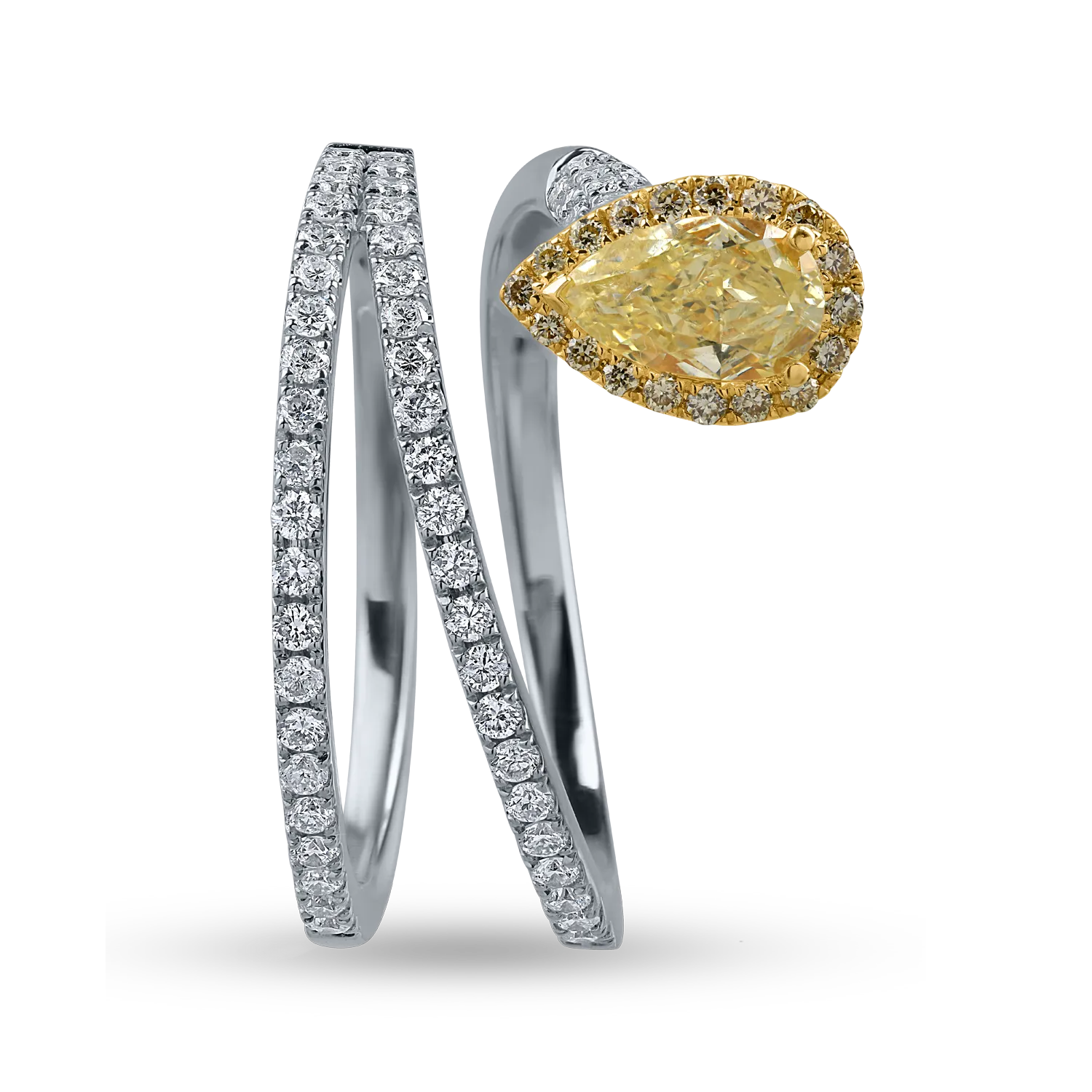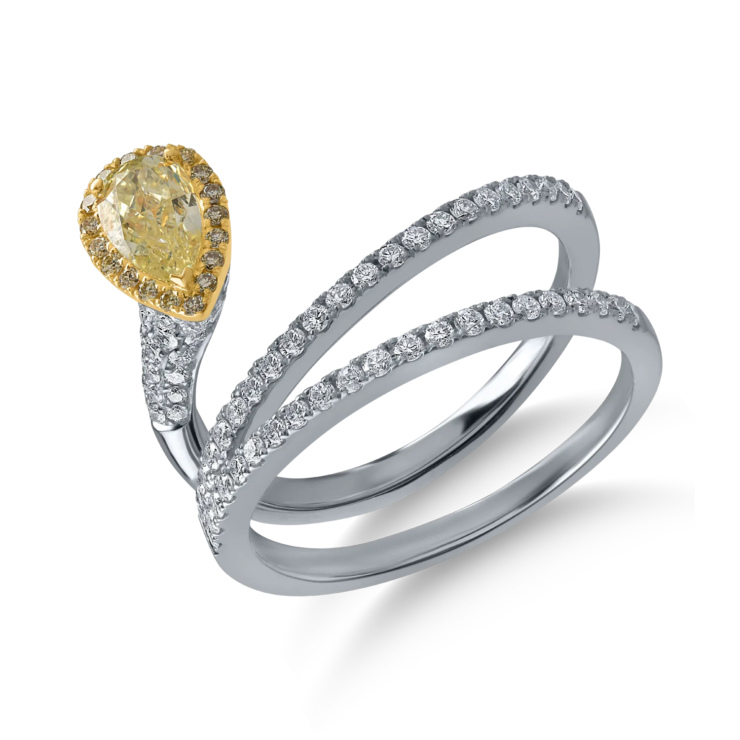 Inel din aur alb cu diamant fancy galben pear de 0.5ct si diamante galbene si incolore de 0.6ct