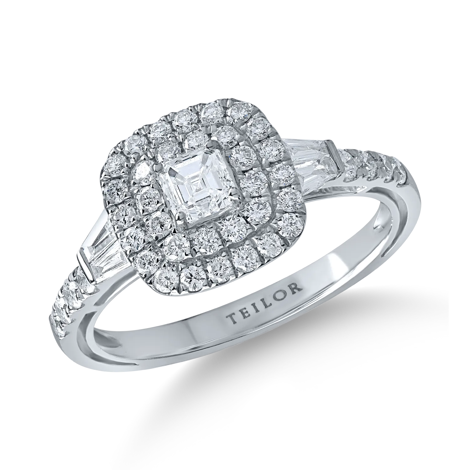 Feminitate si atitudine. Asorteaza acest inel din aur alb cu diamante microsetting cu taietura asscher, baguette si rotunde de 0.94ct tinutelor preferate si exprima-te in mii de feluri. Taieturile asscher si baguette evidentiaza geometria rafinata a designului si pun in valoare stralucirea diamantelor, creand o armonie subtila intre forma si lumina. Perfect echilibrat intre clasic si modern, acest inel aduce o nota de eleganta discreta oricarei tinute. Alege perfectiunea cu TEILOR, o lume in care cream povesti memorabile impreuna cu tine!