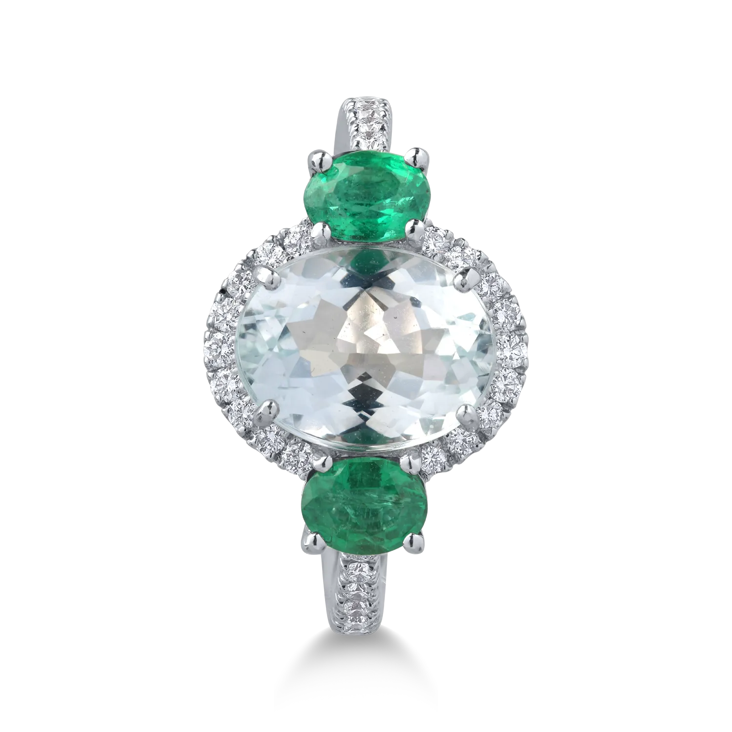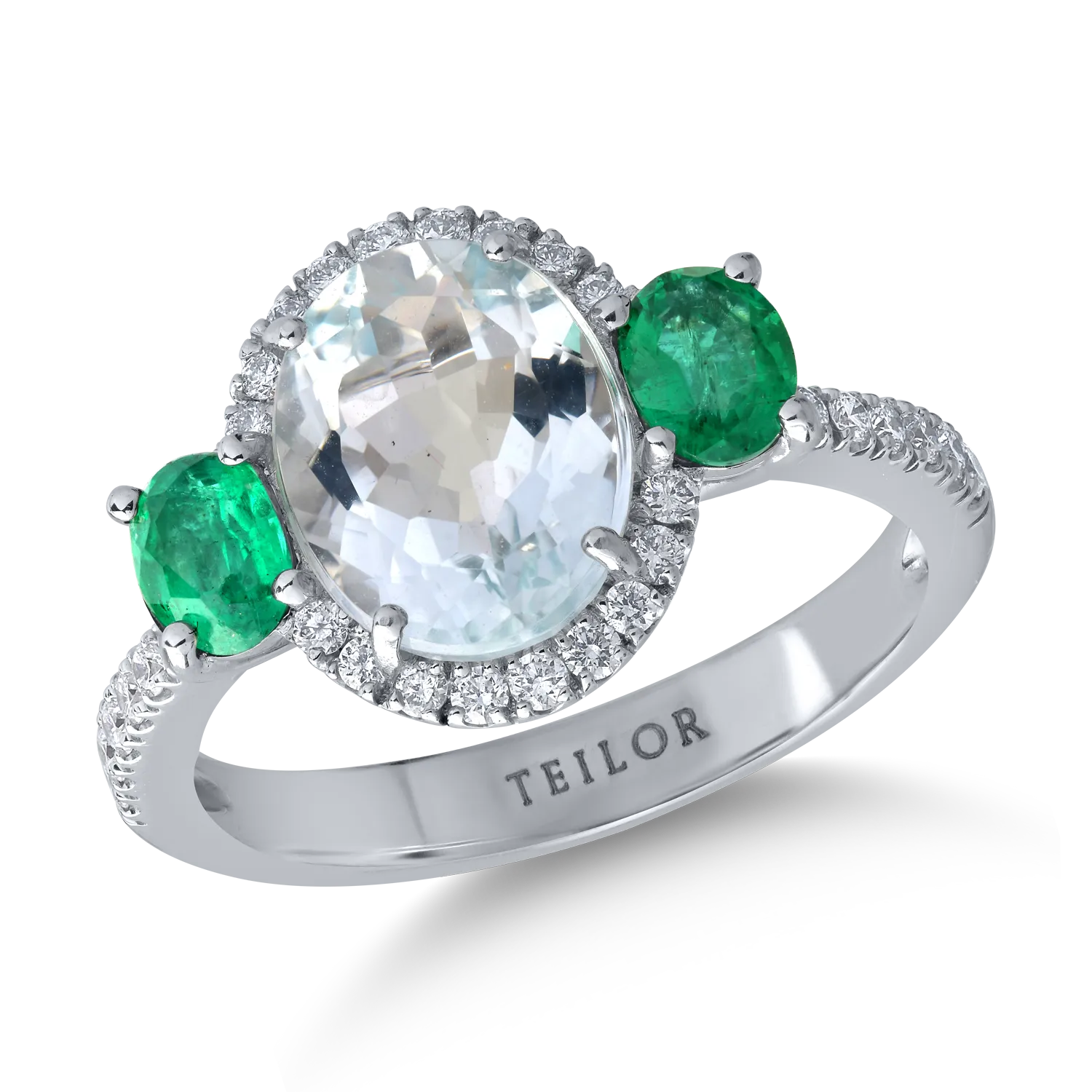 Atunci cand adaugi outfit-urilor tale bijuteria cheie, acestea pot deveni remarcabile. Inelul din aur alb cu pietre pretioase si semipretioase de 3.26ct, avand un acvamarin cu taietura ovala, smaralde cu taietura ovala si diamante stralucitoare, a fost creat din pasiune pentru accesoriile care te fac sa te simti speciala. Contrastul elegant dintre nuantele reci ale acvamarinului si verdele intens al smaraldului este completat perfect de luminozitatea diamantelor. O bijuterie care exprima rafinament, echilibru si feminitate pura. Alege piesele care ti se potrivesc perfect cu TEILOR!