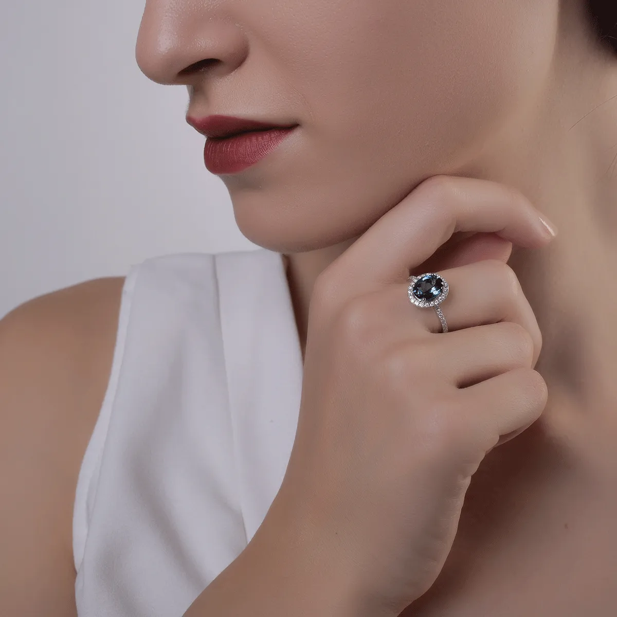 Exista bijuterii care te cuceresc de la prima vedere, iar acest inel din aur alb cu topaz London blue cu taietura ovala de 2.2ct si diamante de 0.2ct este o expresie a elegantei moderne. Culoarea adanca a topazului, cu reflexe de albastru intens, creeaza un contrast spectaculos cu luminozitatea diamantelor ce il inconjoara. Taietura ovala pune in valoare claritatea si profunzimea pietrei centrale, in timp ce montura din aur alb adauga un aer sofisticat si echilibrat. O bijuterie versatila, creata pentru femeia care apreciaza rafinamentul subtil. Descopera frumusetea atemporala semnata TEILOR!