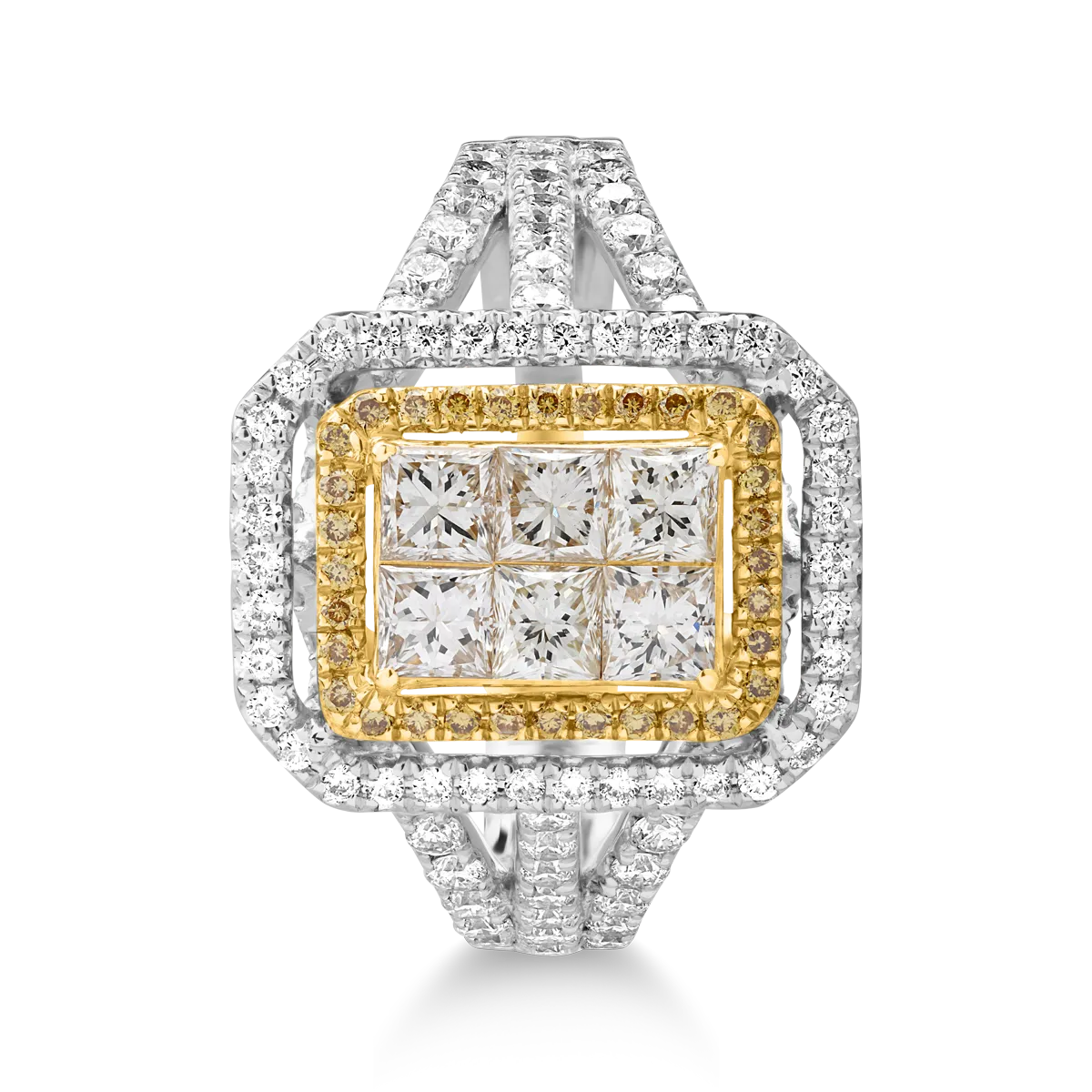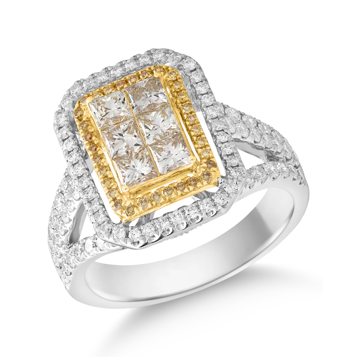 Inel din aur alb-galben cu diamante fancy galbene si diamante incolore princess si rotunde de 1.7ct