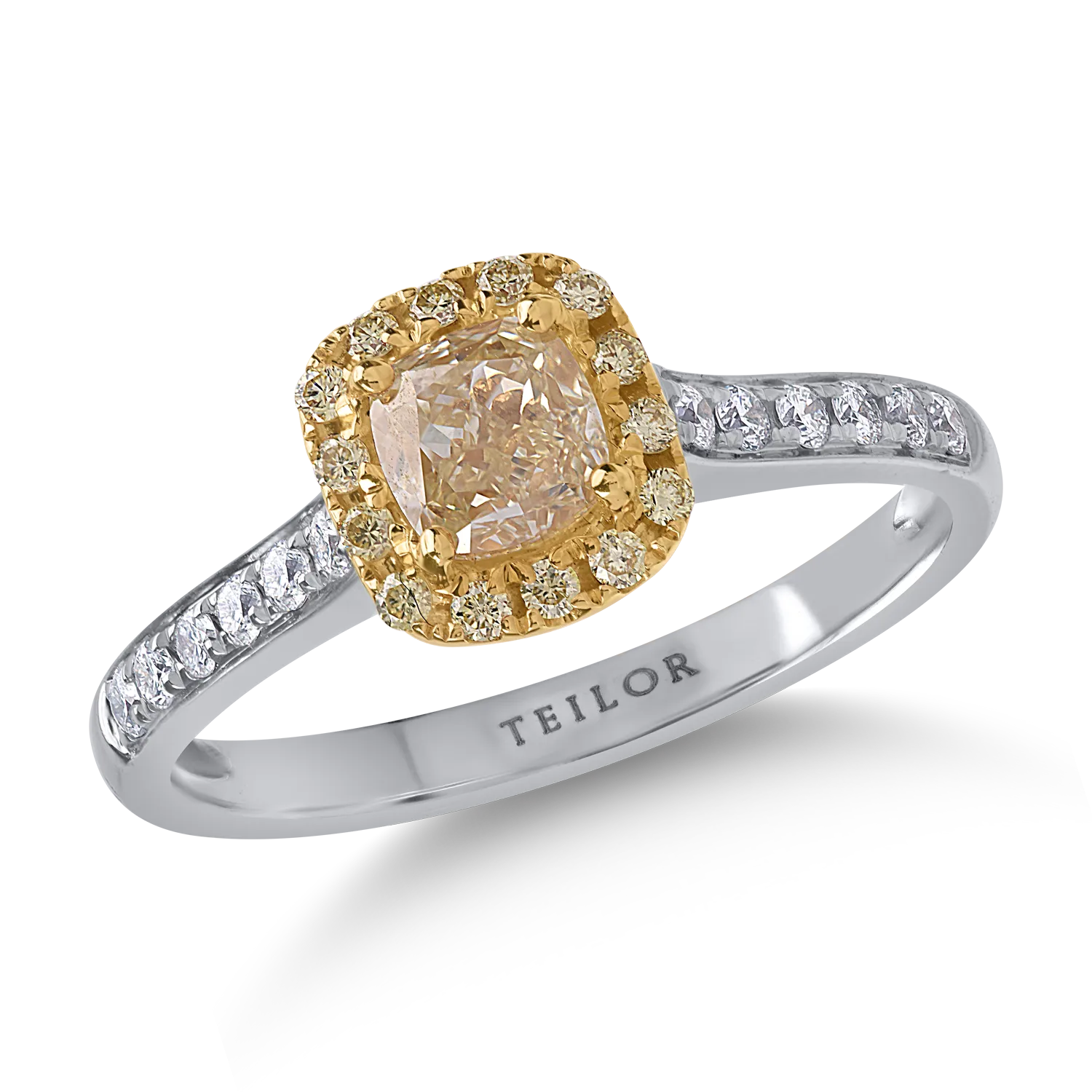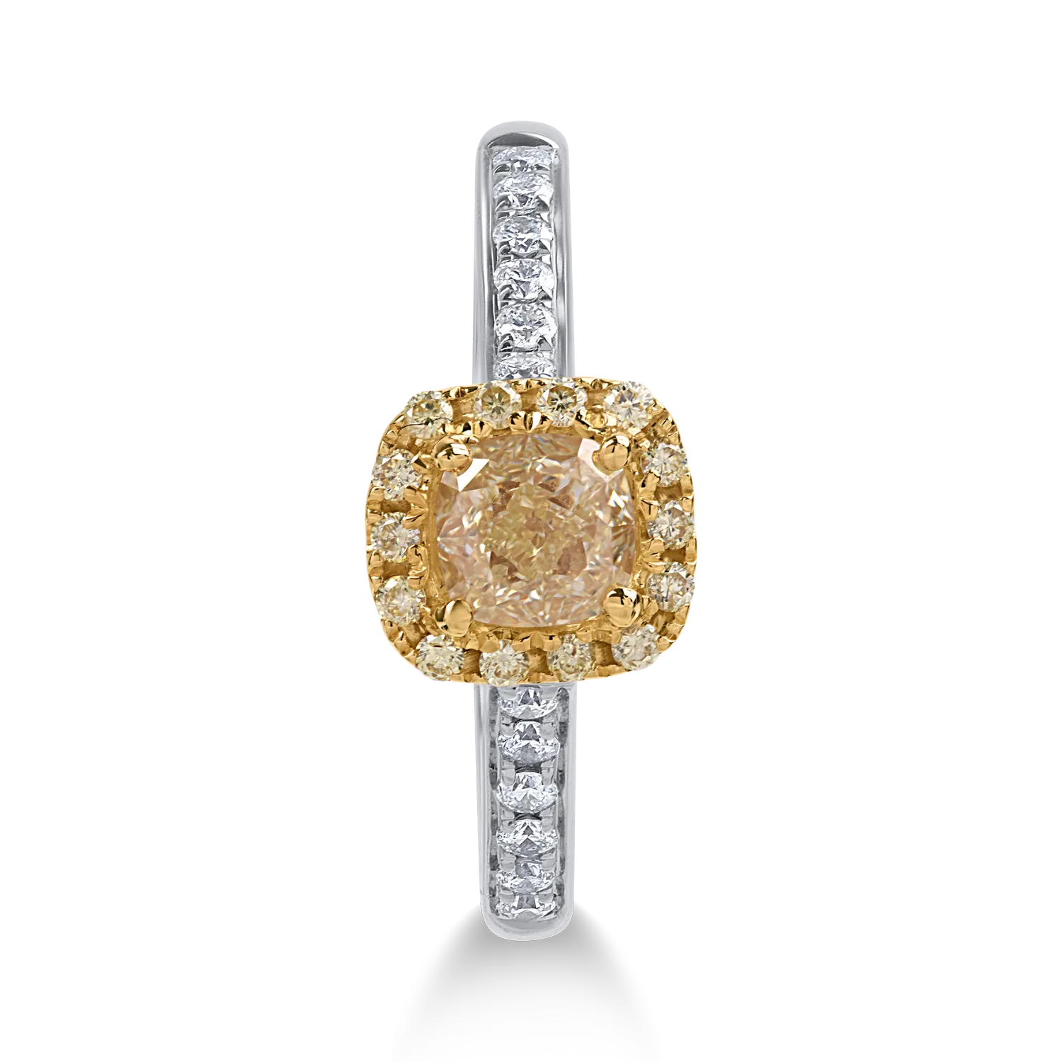Inel din aur alb-galben cu diamante galbene cushion si rotunde de 0.81ct si diamante transparente de 0.16ct