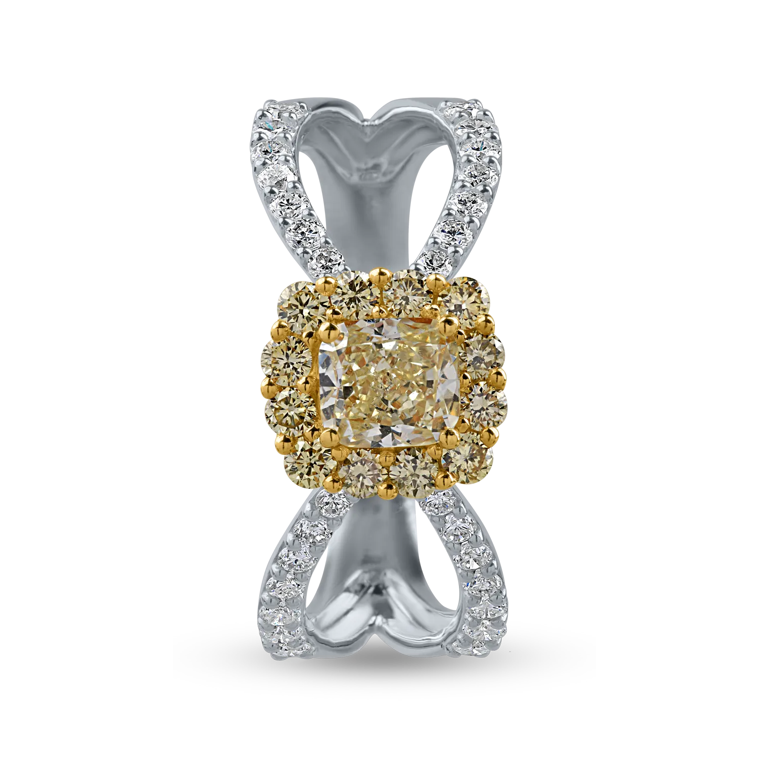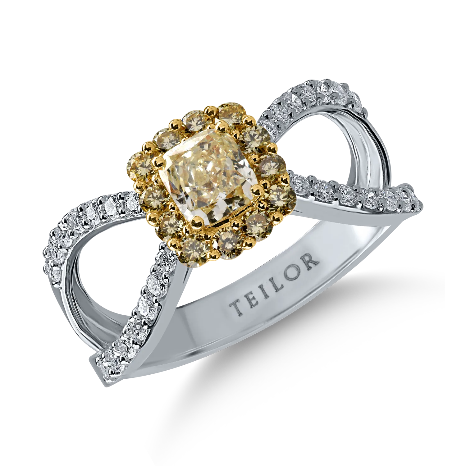 Inel din aur alb-galben cu diamante galbene cushion si rotunde de 0.8ct si diamante transparente de 0.3ct