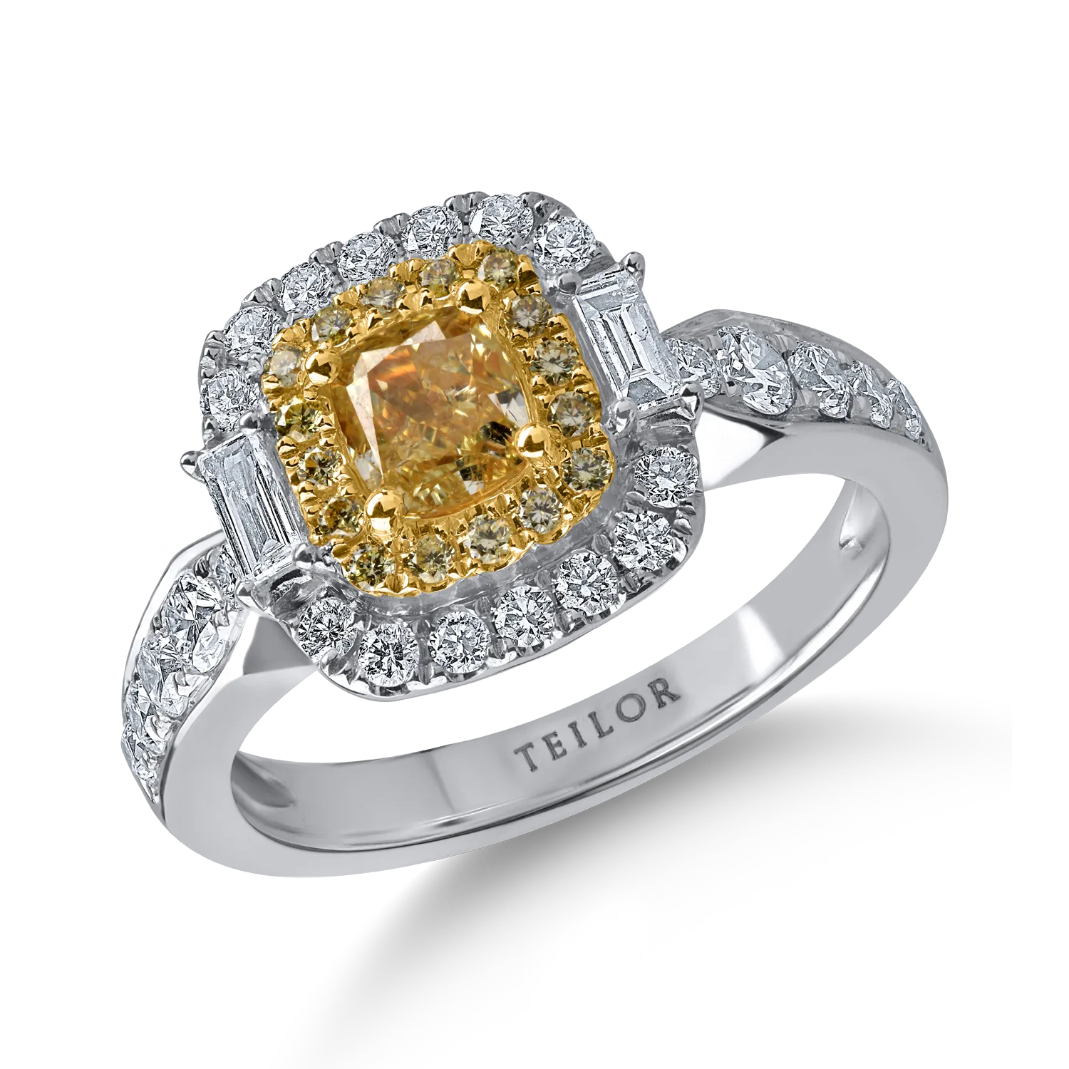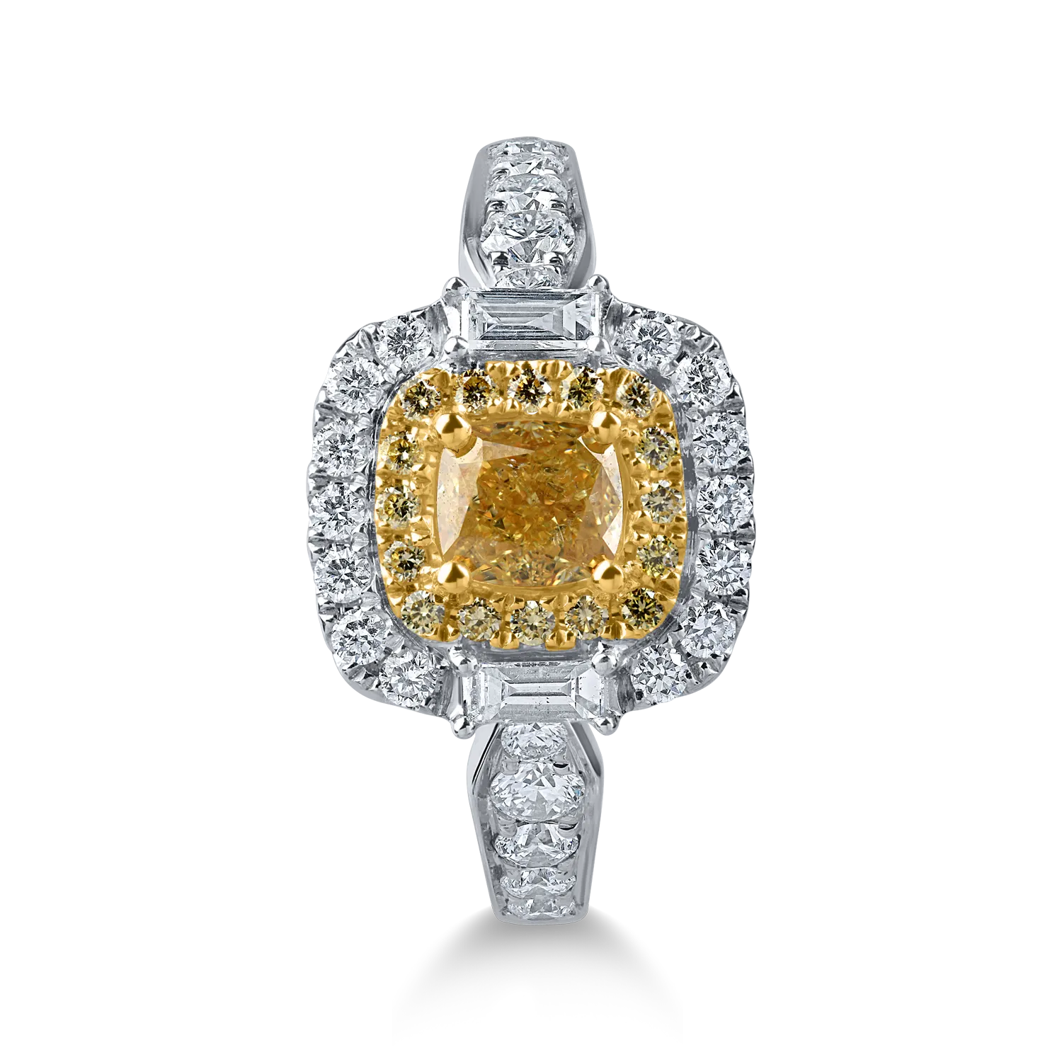 Inel din aur alb-galben cu diamante galbene rectangulare si rotunde si diamante incolore baguette si rotunde de 1.5ct