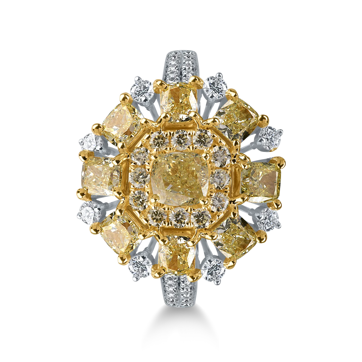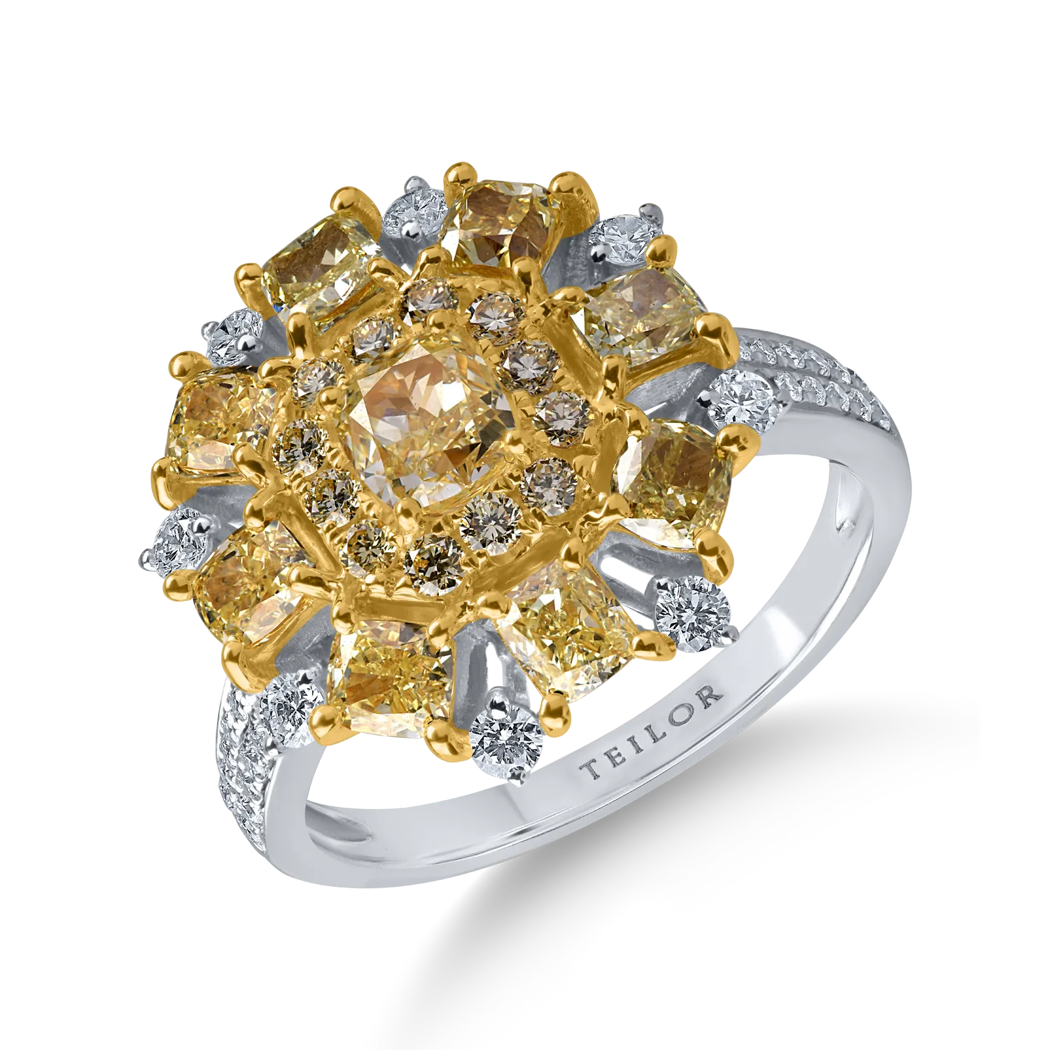 Inel din aur alb-galben cu diamante galbene rectangulare si rotunde si incolore de 2.8ct