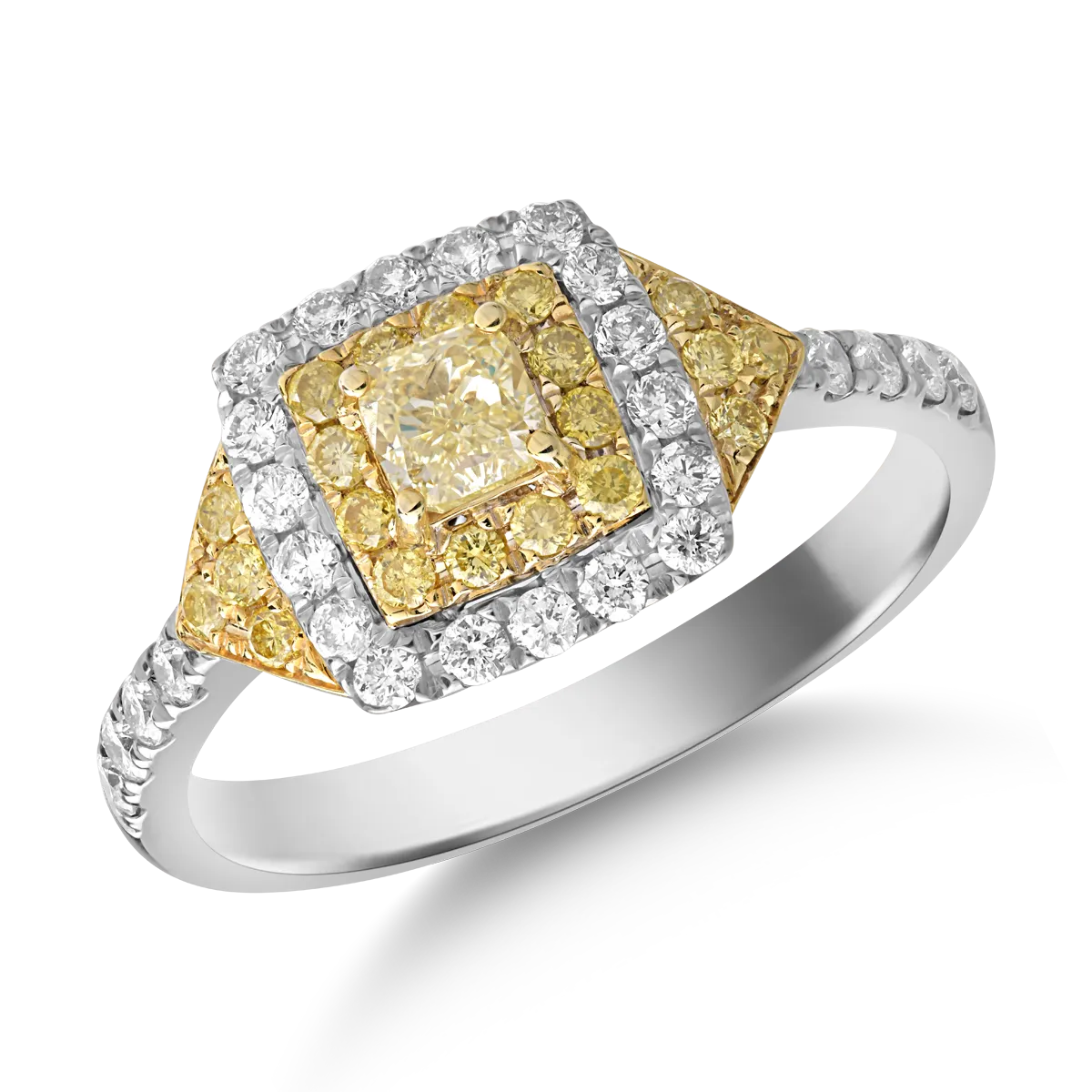 Inel din aur alb-galben cu diamante transparente de 0.39ct si diamante galbene cushion si rotunde de 0.54ct