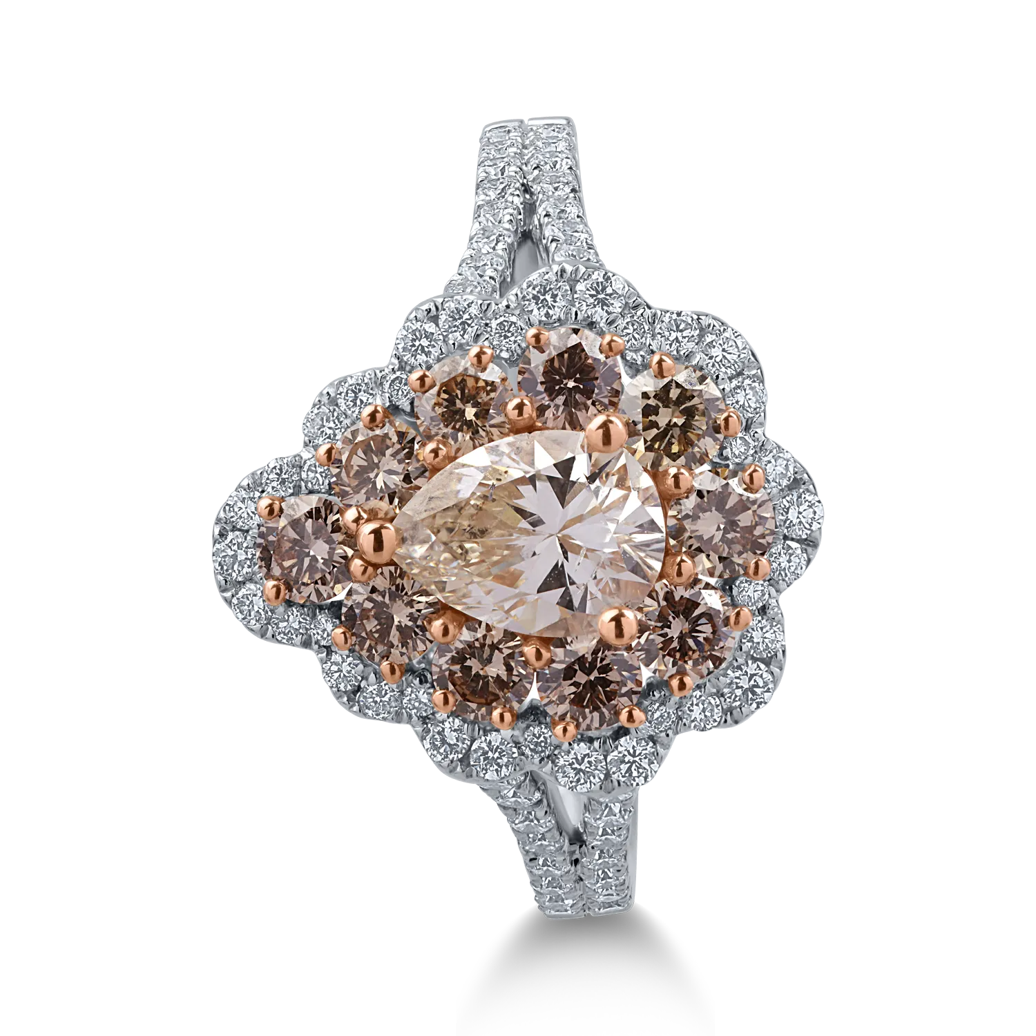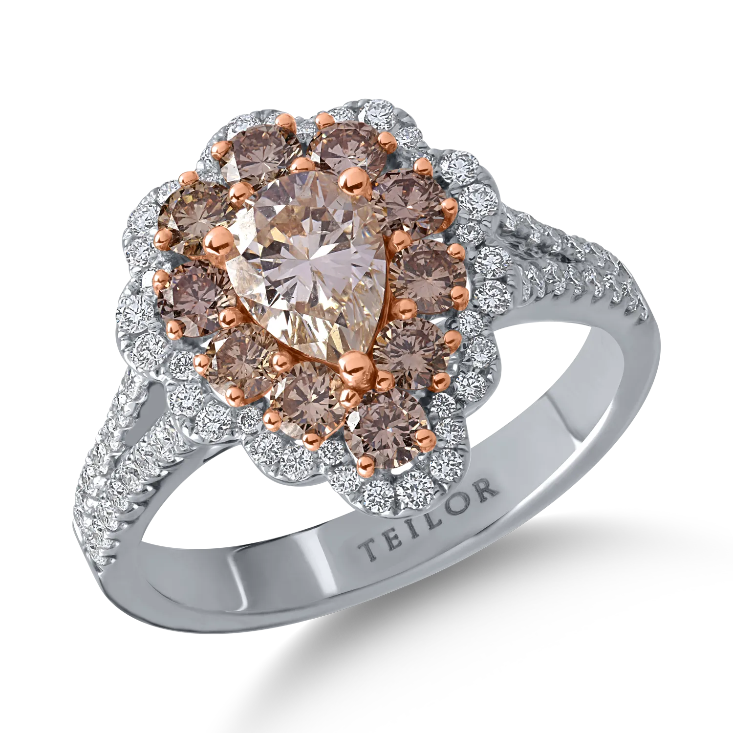 Inel din aur alb-roz cu diamante maro pear si rotunde de 1.72ct si diamante transparente de 0.41ct