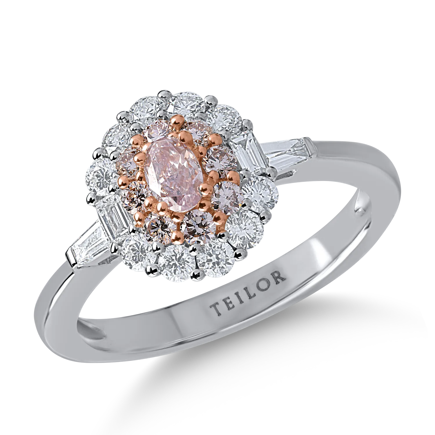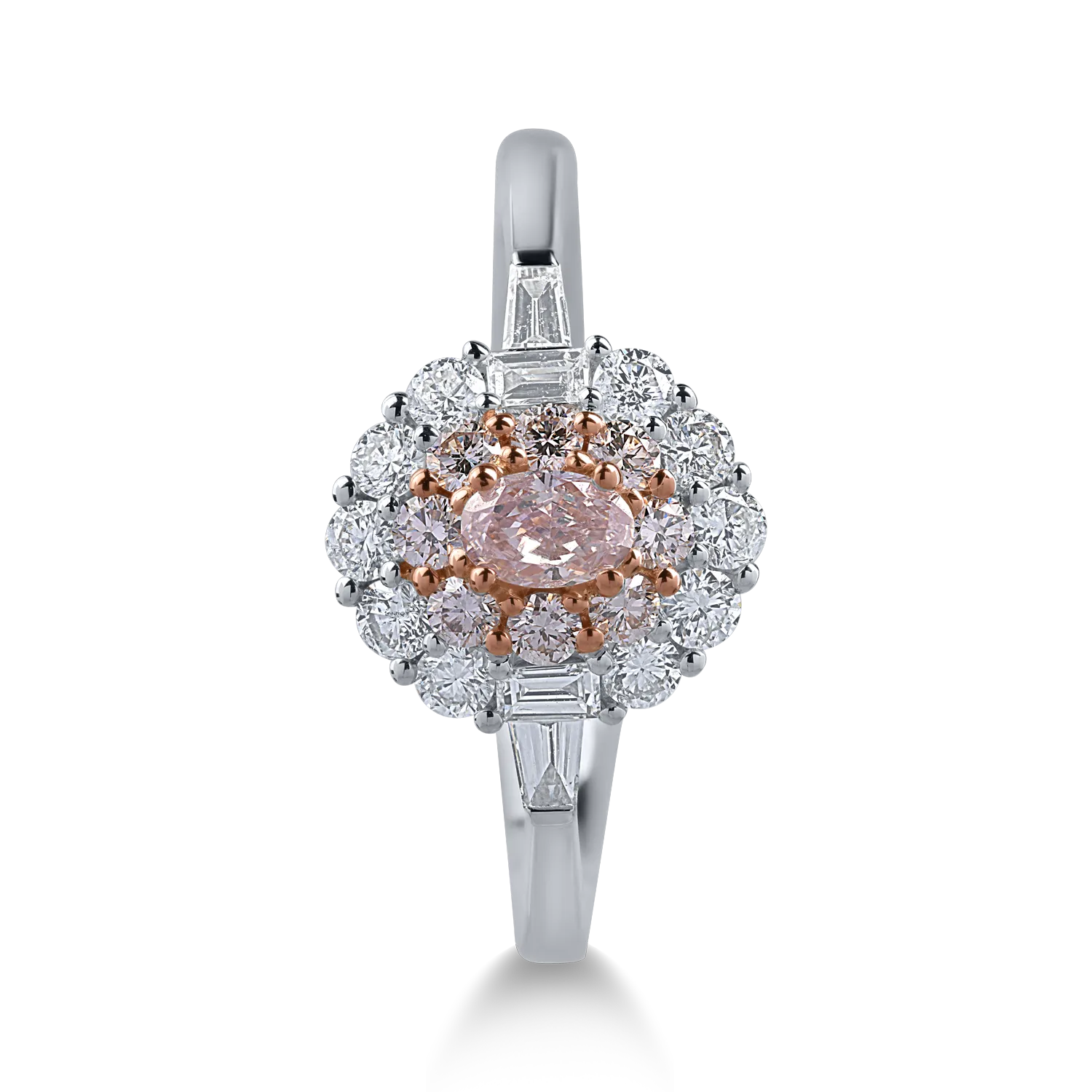 Inel din aur alb-roz cu diamante transparente baguette si rotunde de 0.5ct si diamante roz ovale si rotunde de 0.4ct