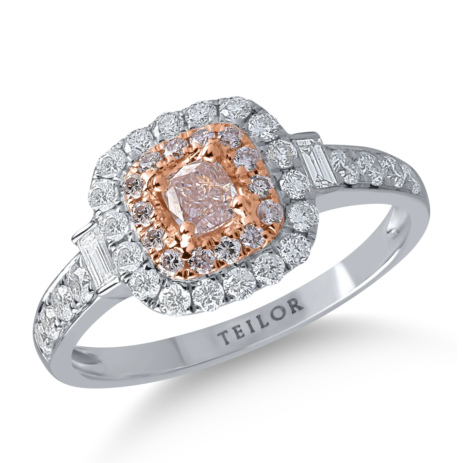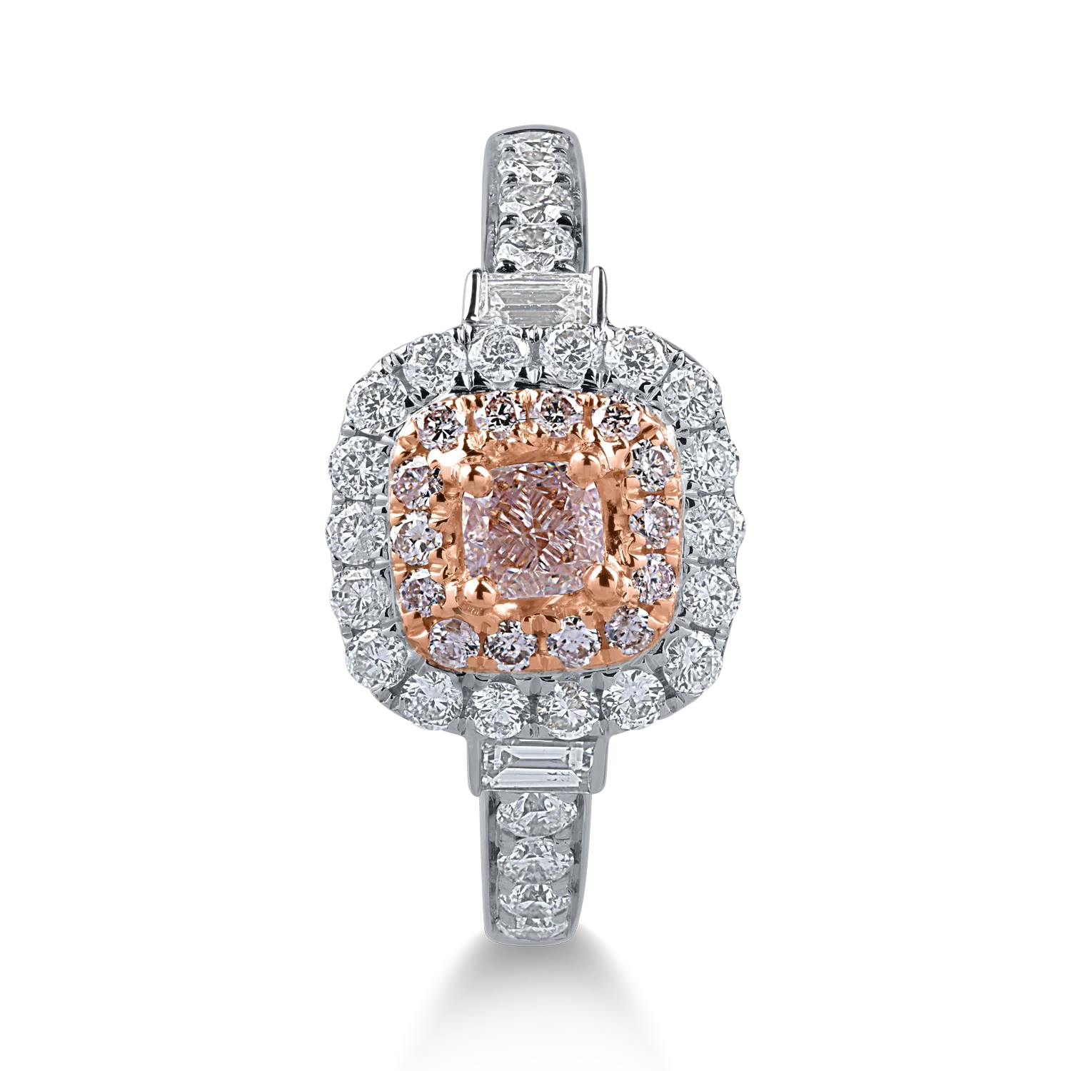 Inel din aur alb-roz cu diamante transparente baguette si rotunde de 0.6ct si diamante roz cushion si rotunde de 0.38ct