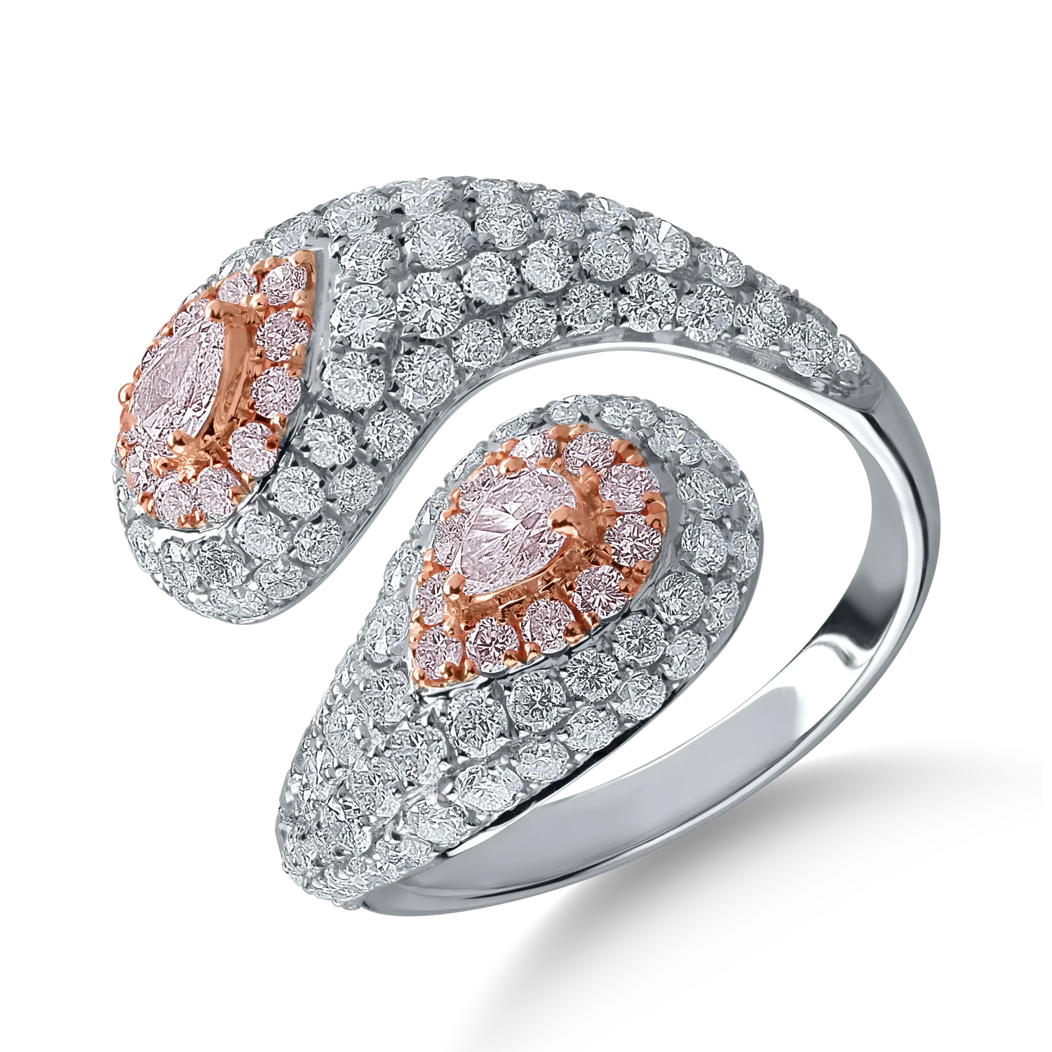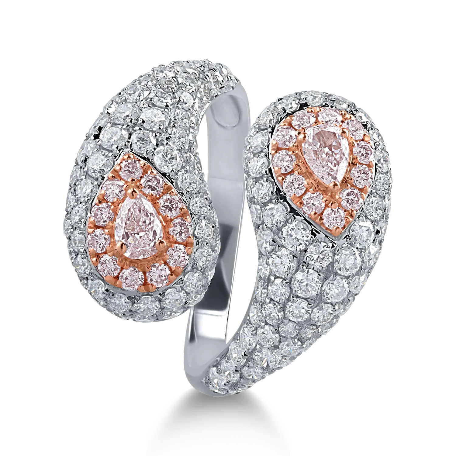 Inel din aur alb-roz cu diamante transparente de 2.09ct si diamante roz pear si rotunde de 0.59ct