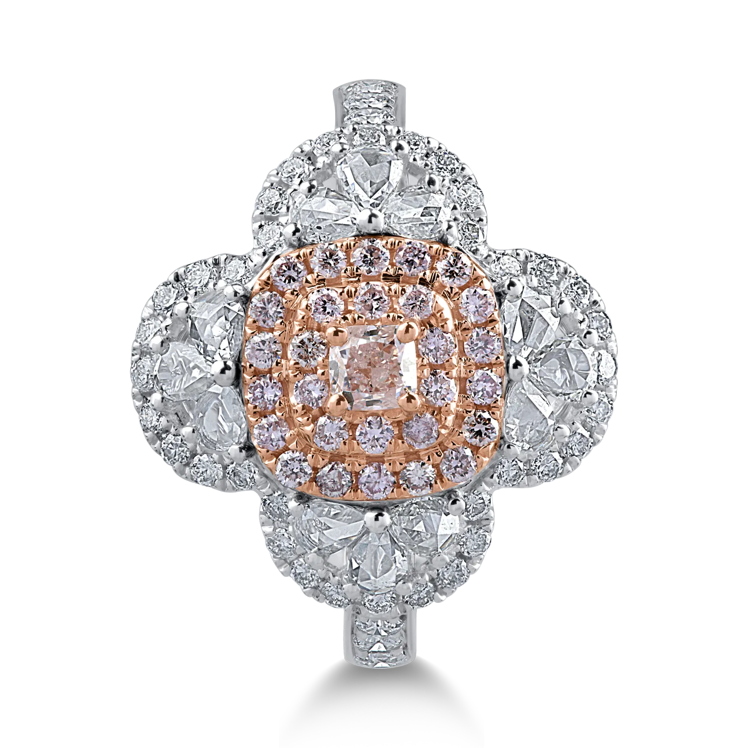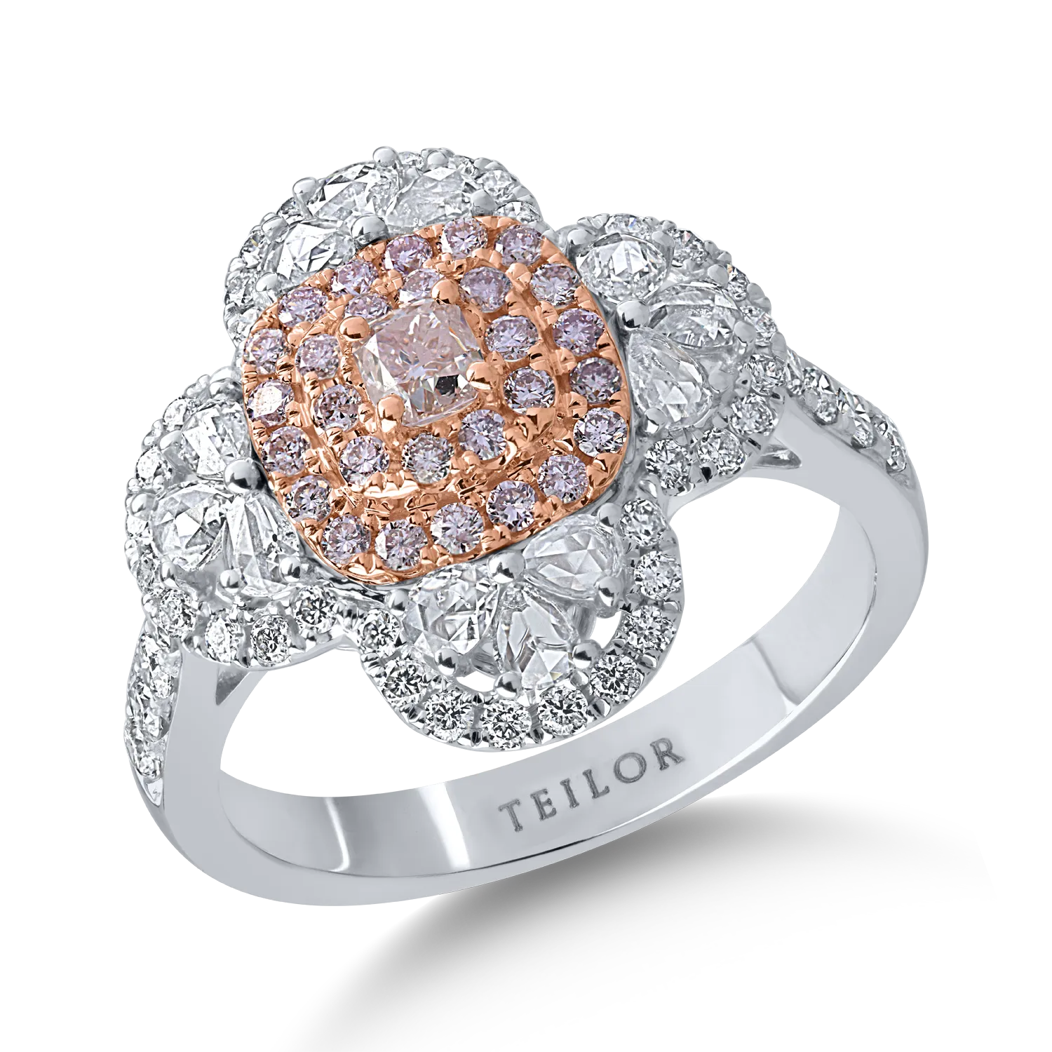 Inel din aur alb-roz cu diamante transparente rose si rotunde de 0.86ct si diamante roz cushion si rotunde de 0.43ct