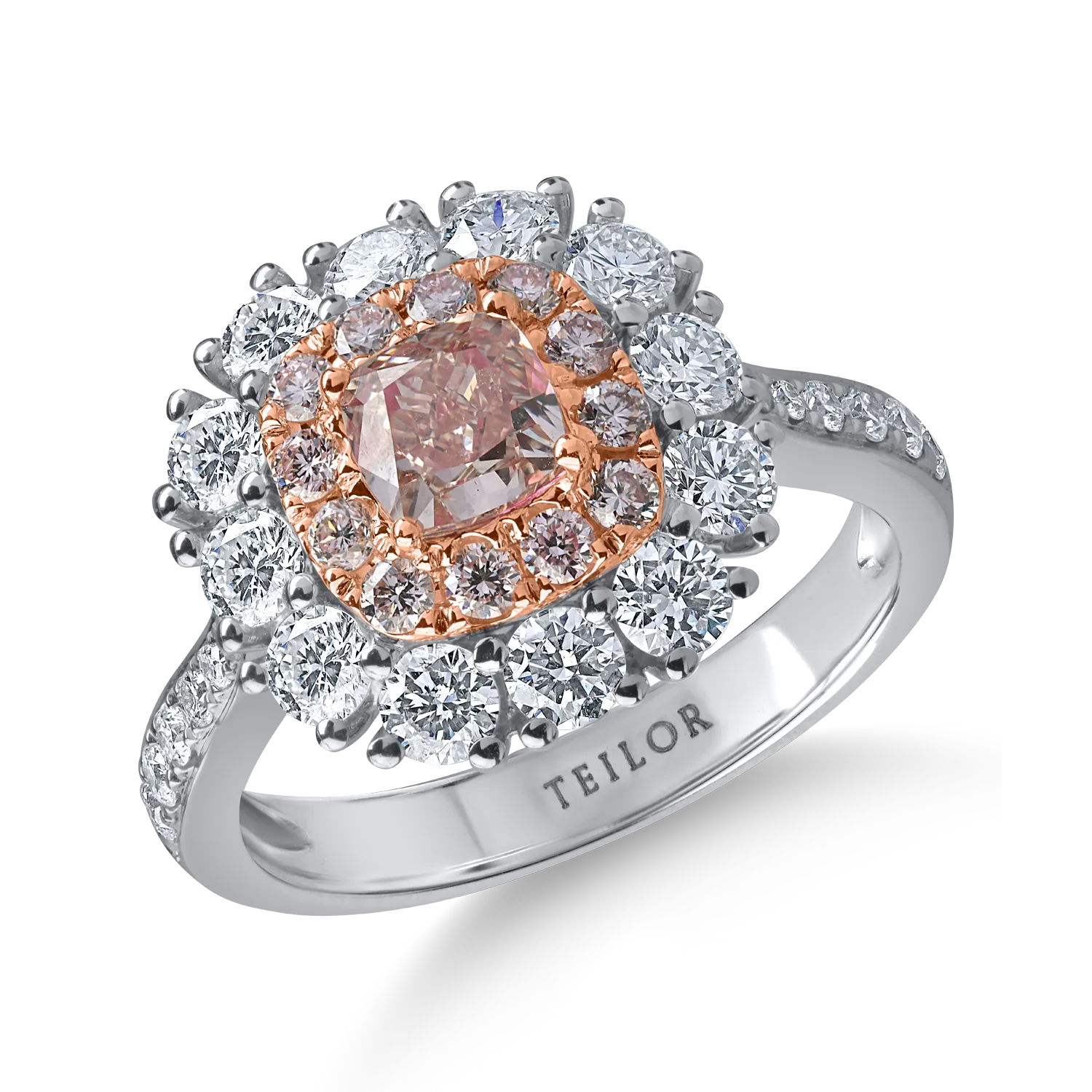 Inel din aur alb-roz cu un diamant fancy roz cushion de 0.7ct si diamante roz si incolore de 1.5ct
