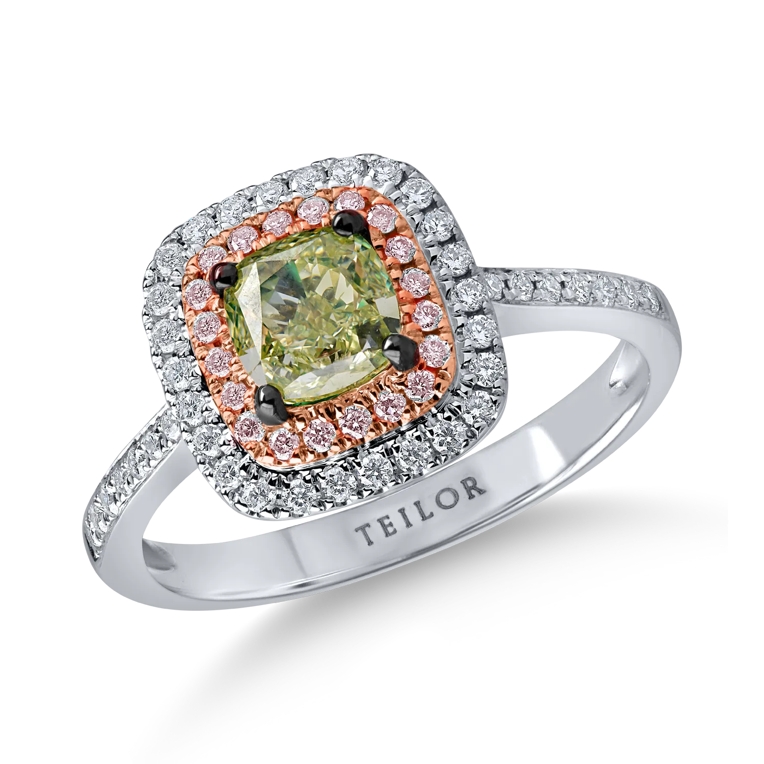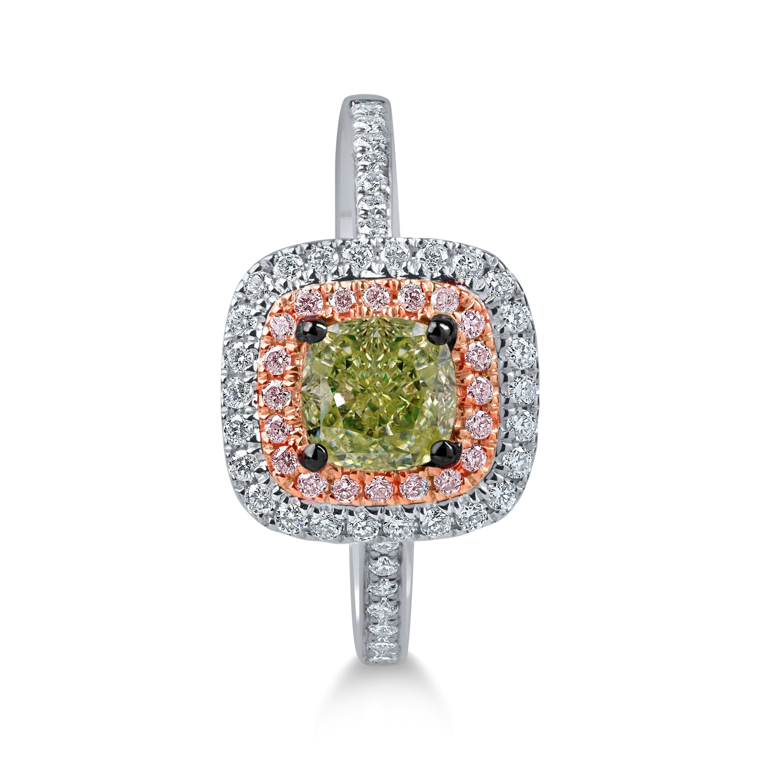 Inel din aur alb-roz cu un diamant verde cushion de 1ct si diamante incolore de 0.3ct