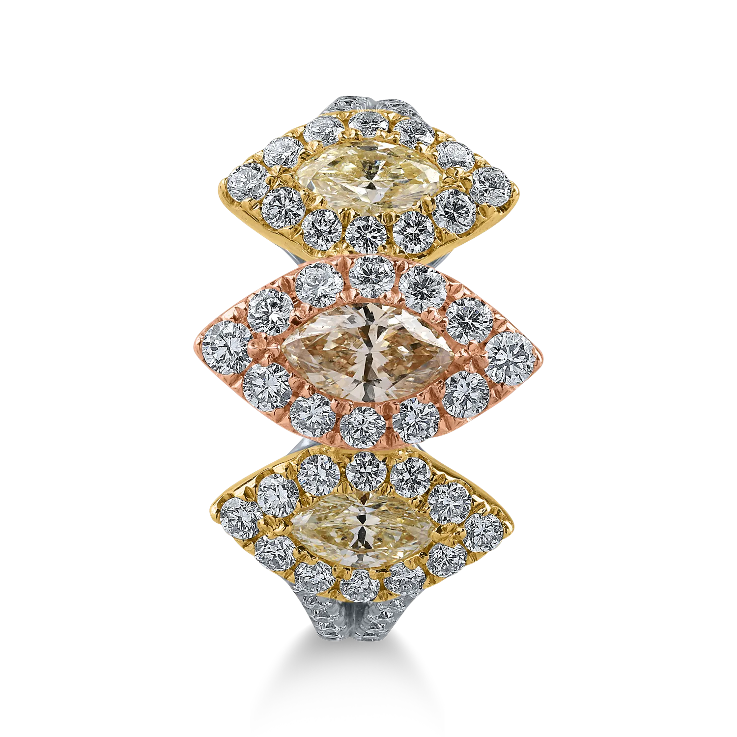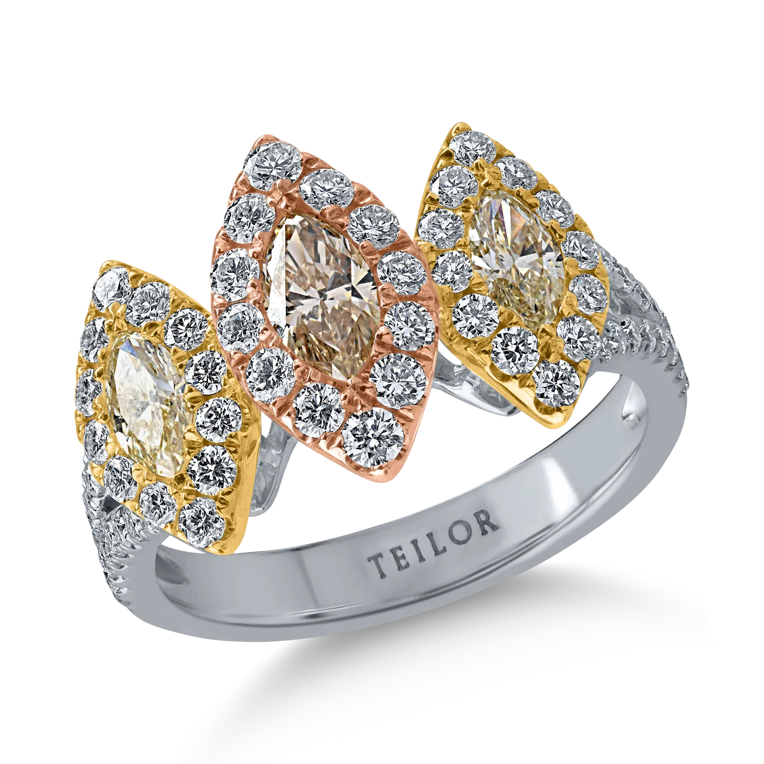 Inel din aur alb-roz-galben cu diamant maro marquise de 0.3ct si diamante galbene de 0.4ct