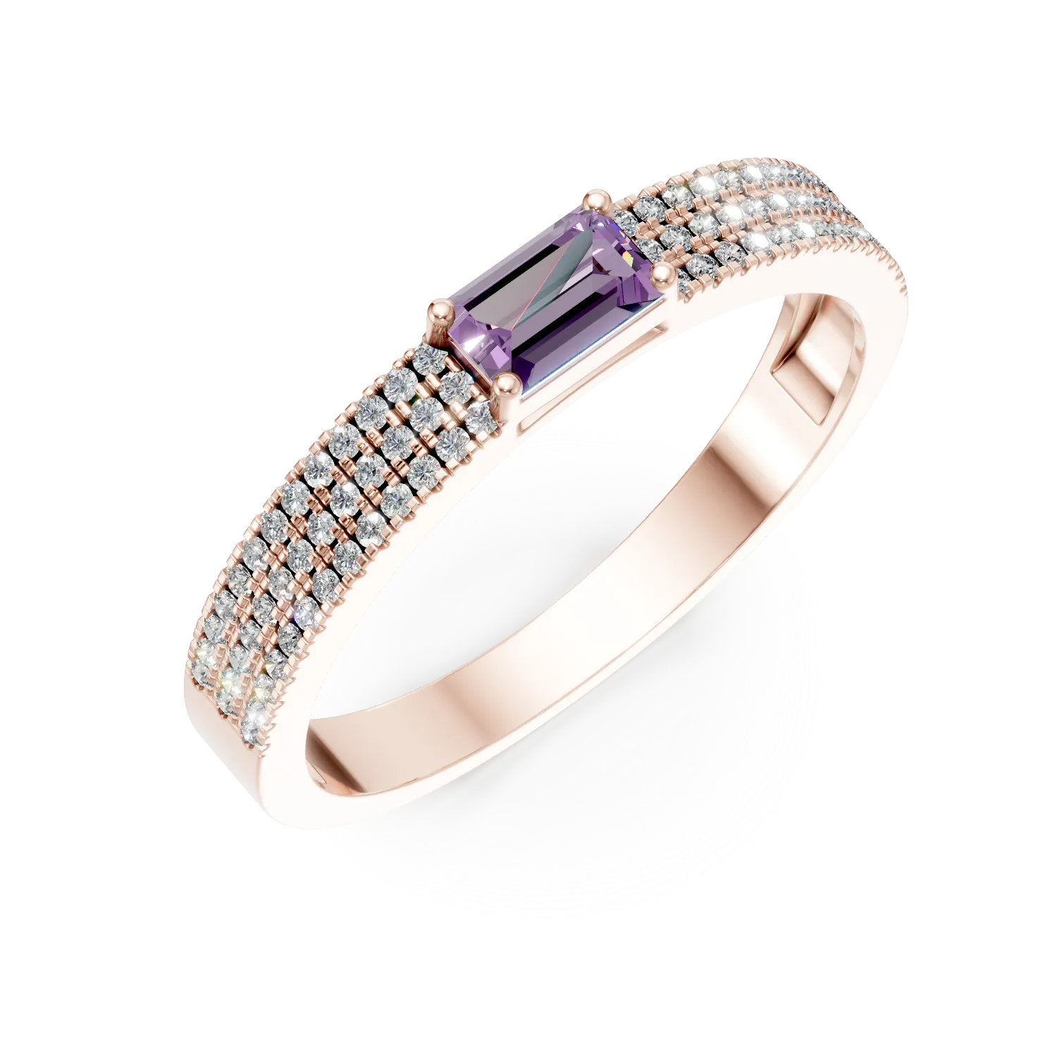 Inel din aur roz cu safir roz baguette de 0.3ct si diamante microsetting de 0.2ct