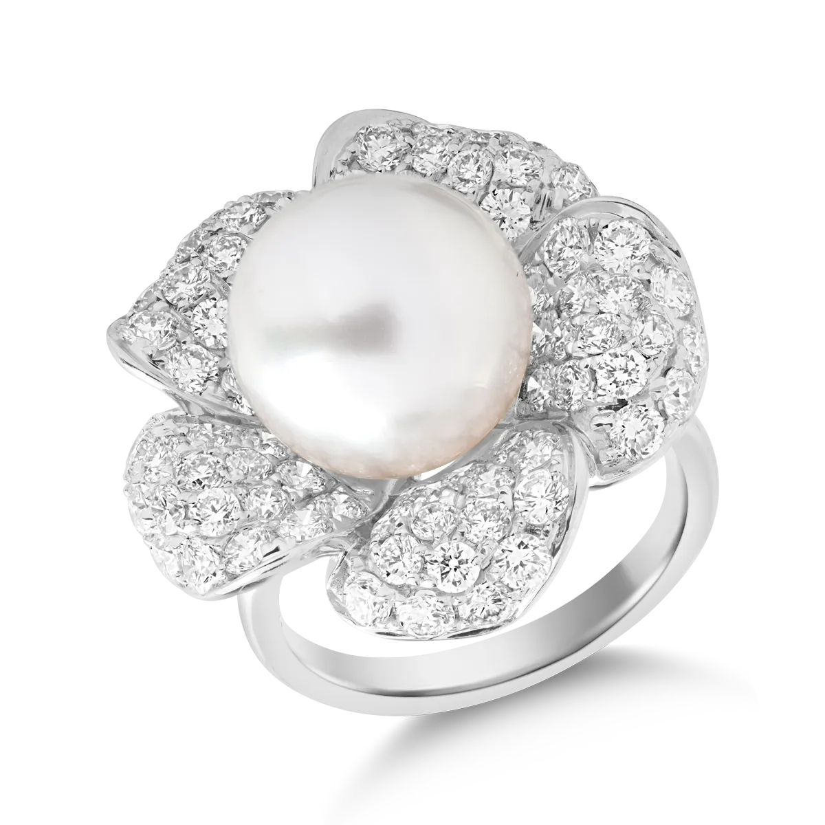 Inel floare din aur alb cu perla de cultura de 12.25ct si diamante de 2.99ct