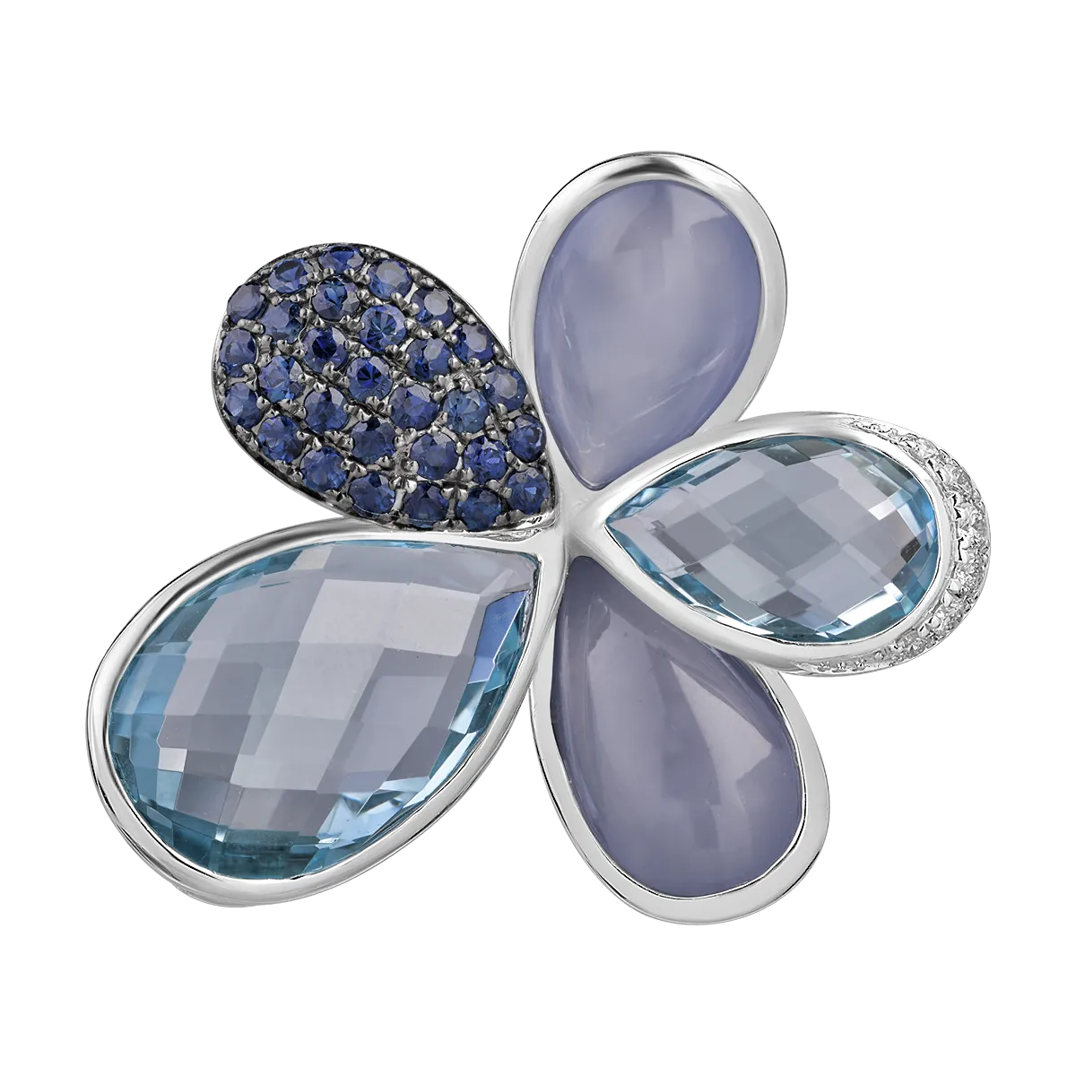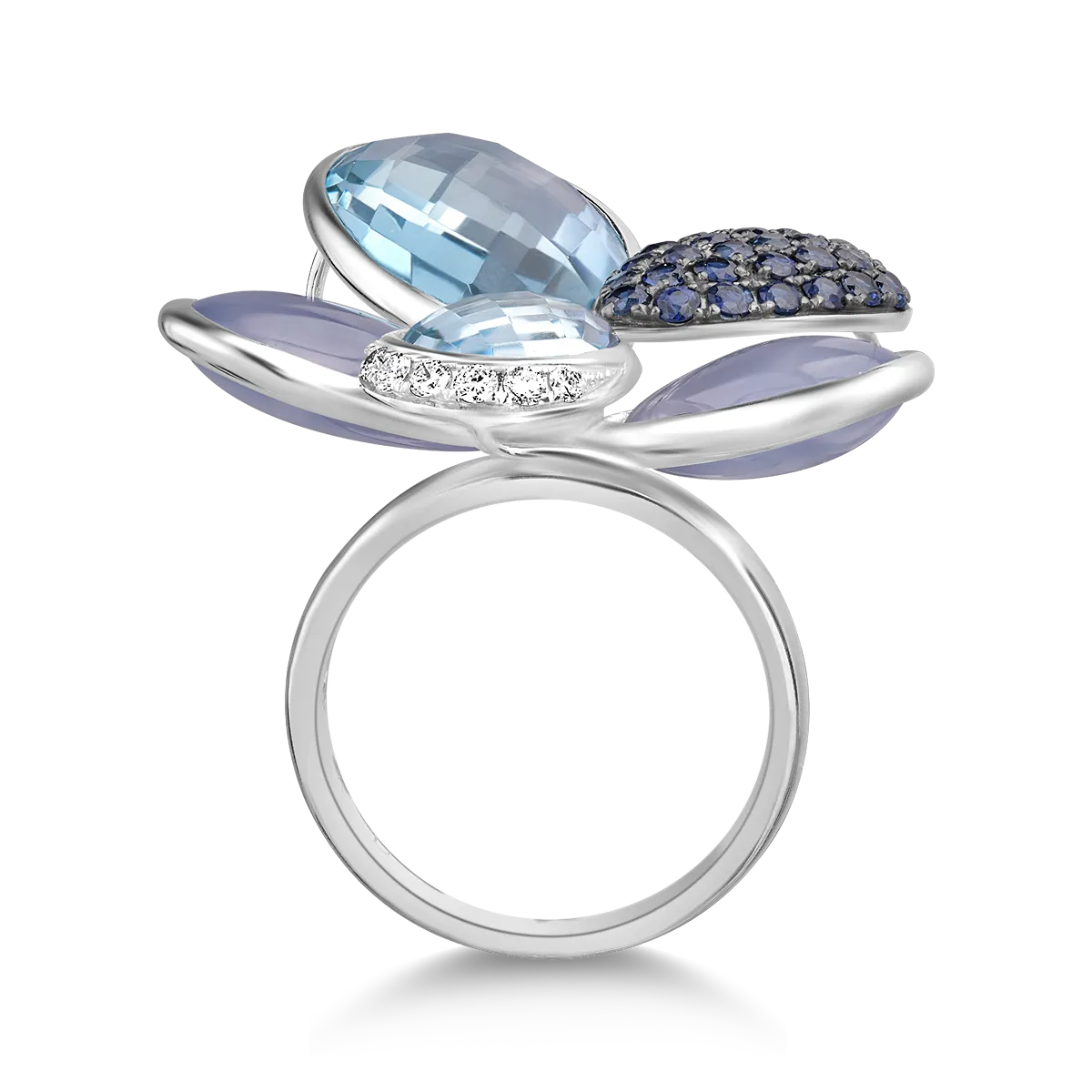 Inelul floare din aur alb impresioneaza prin designul sau sofisticat si compozitia spectaculoasa de pietre pretioase si semipretioase de 25.9ct . Topazele albastre si calcedoniile cu taietura pear se armonizeaza perfect cu stralucirea safirelor si eleganta atemporala a diamantelor. Jocul de culori si lumini creeaza un efect vizual distinctiv, care evidentiaza delicatetea formei florale si rafinamentul executiei. O bijuterie statement, conceputa pentru femeia care apreciaza eleganta autentica si expresia moderna a luxului. Descopera colectia de inele spectaculoase la TEILOR!