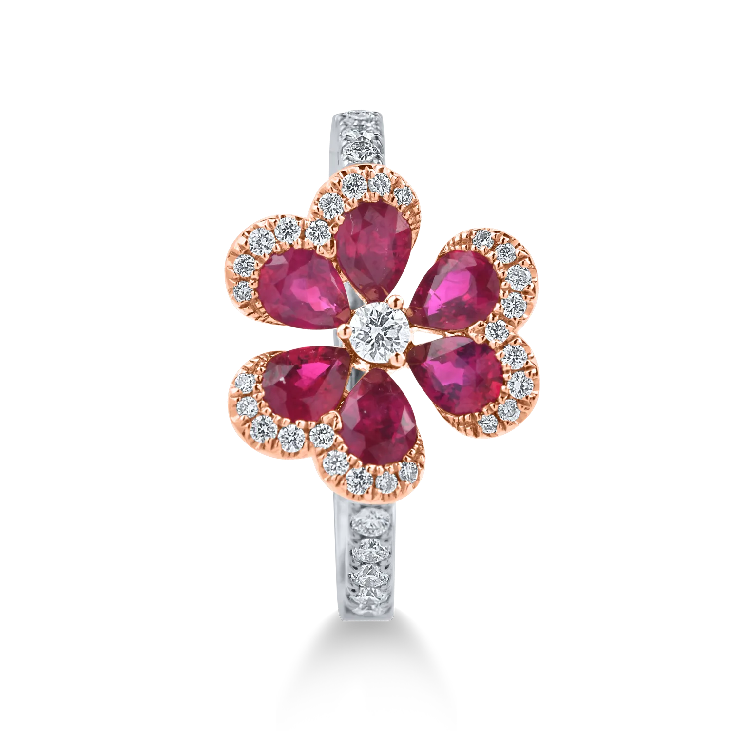 Inel floare din aur alb-roz cu rubine pear de 1ct si diamante de 0.3ct