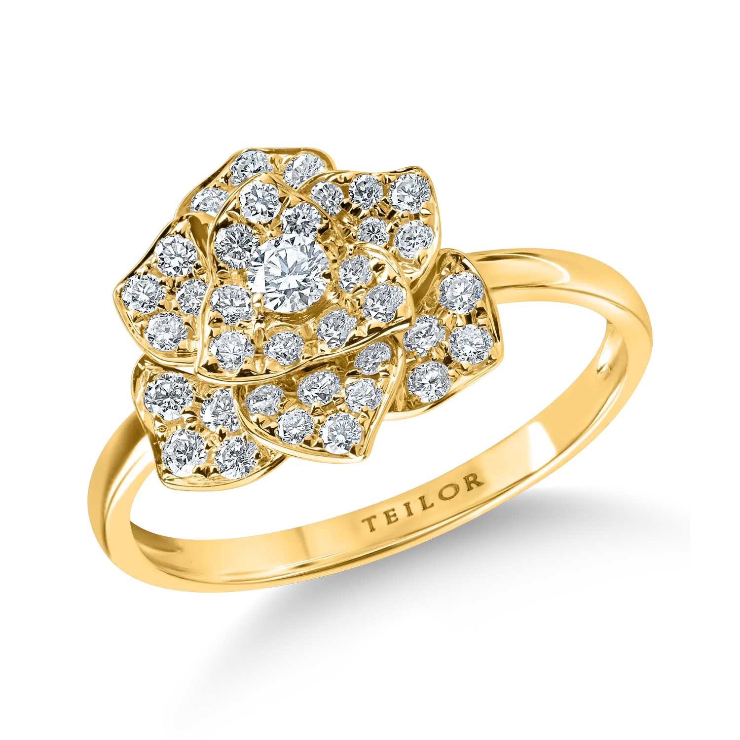 Stil si personalitate. Inelul floare din aur galben cu diamante de 0.4ct este o declaratie de stil, perfect pentru a adauga un accent deosebit oricarei tinute. Cu un amestec de forme si texturi, fiecare piesa TEILOR te invita sa te exprimi liber. Gaseste-l pe cel care te defineste!