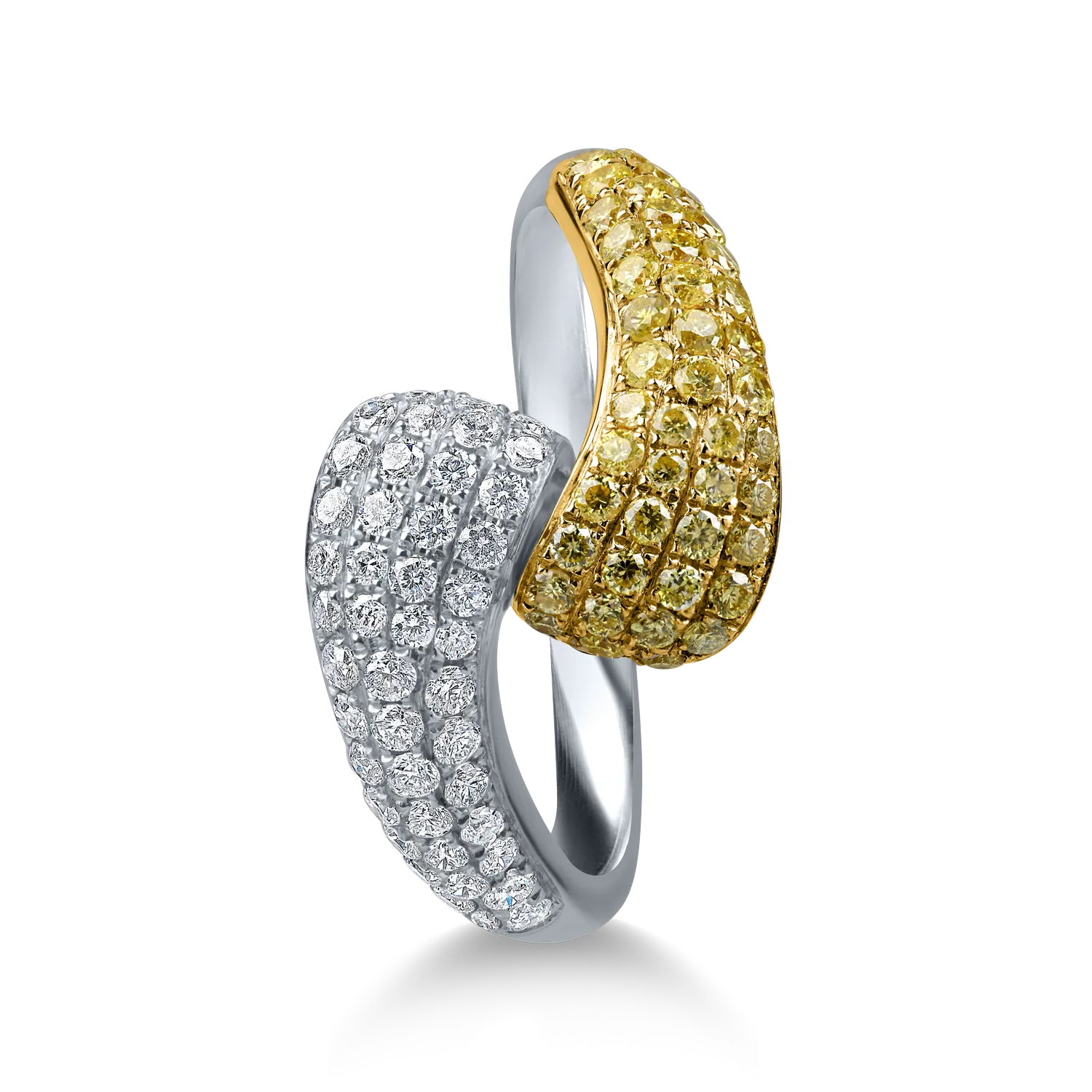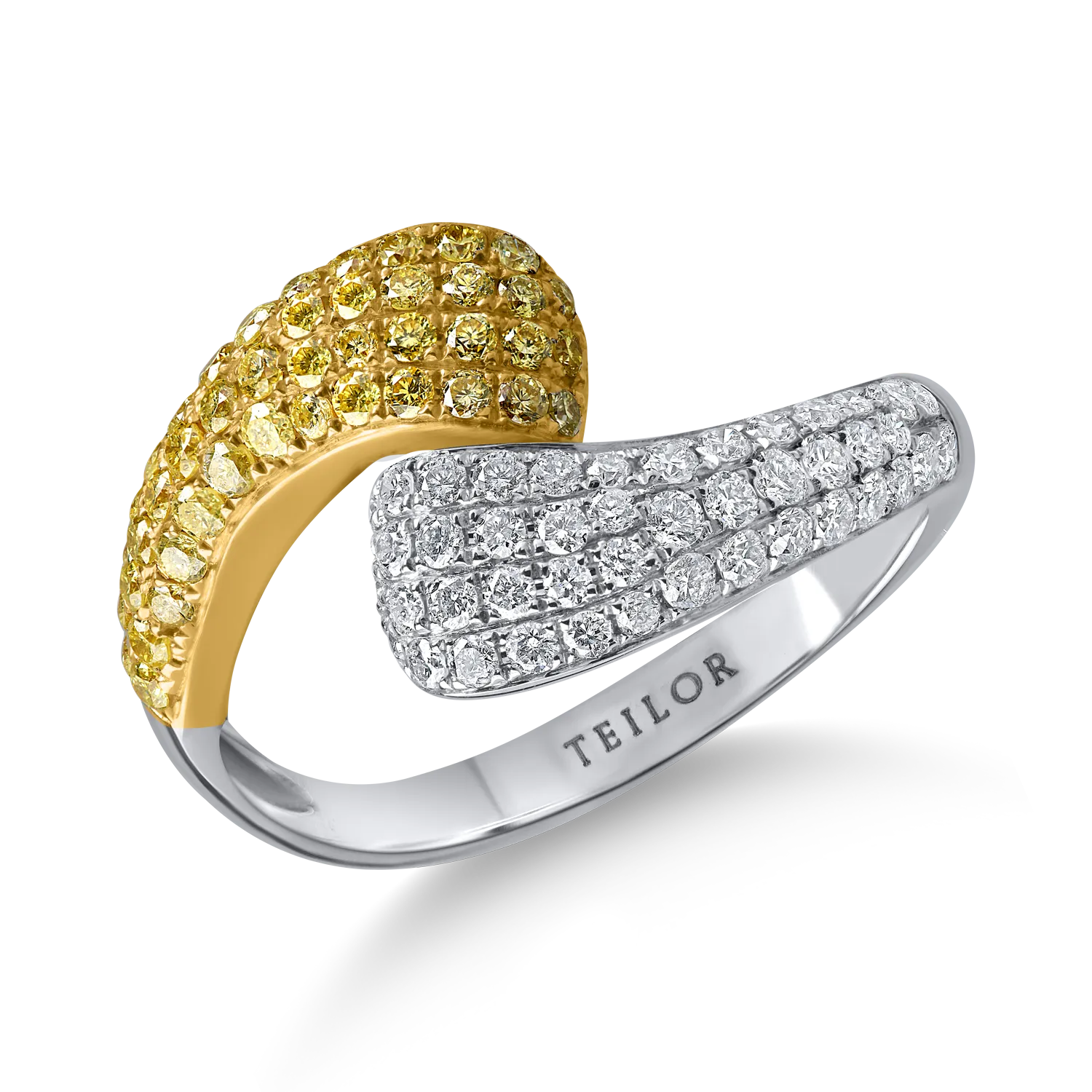 Inel geometric din aur alb-galben cu diamante galbene si incolore de 0.86ct