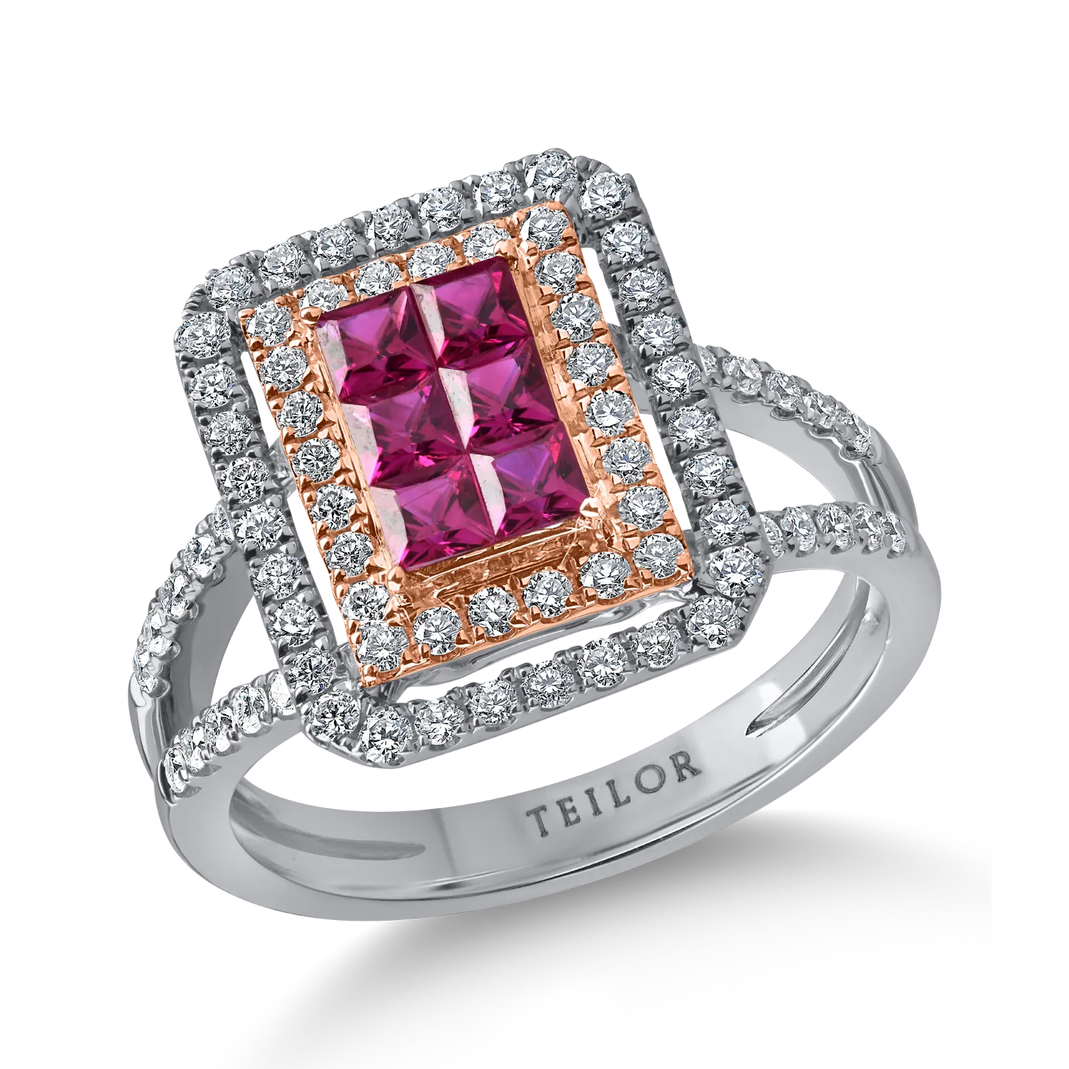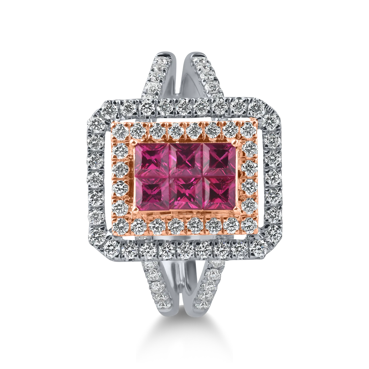 Inel geometric din aur alb-roz cu rubine princess de 0.63ct si diamante de 0.6ct