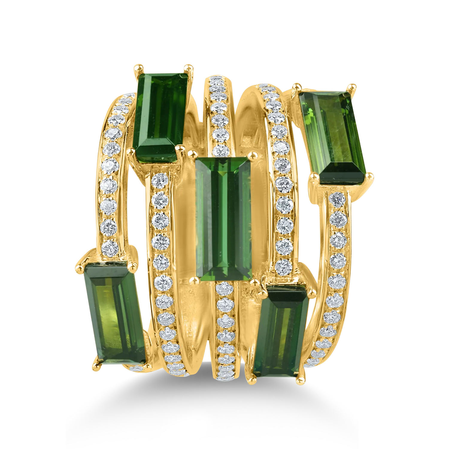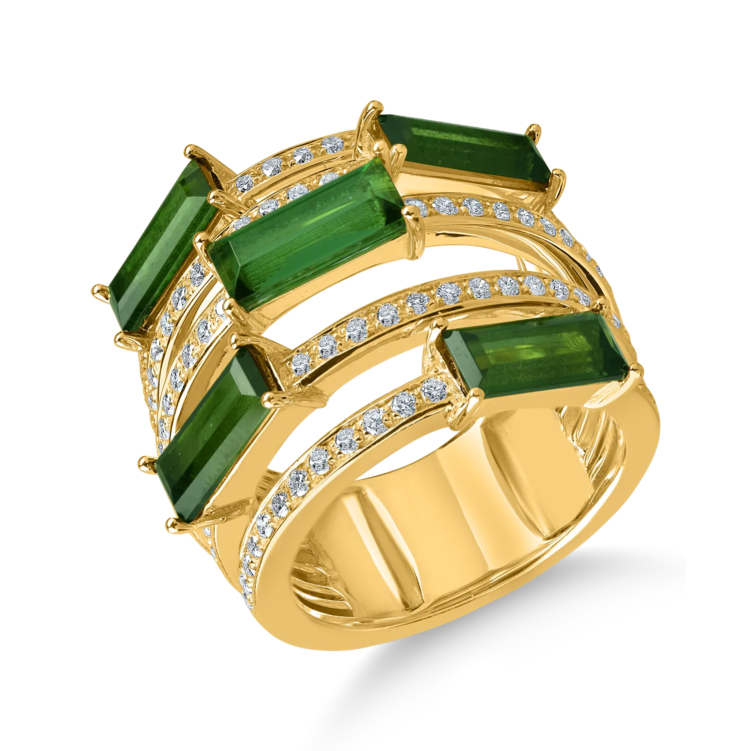 Inel geometric din aur galben cu turmaline verzi rectangulare de 5.66ct si diamante de 0.86ct