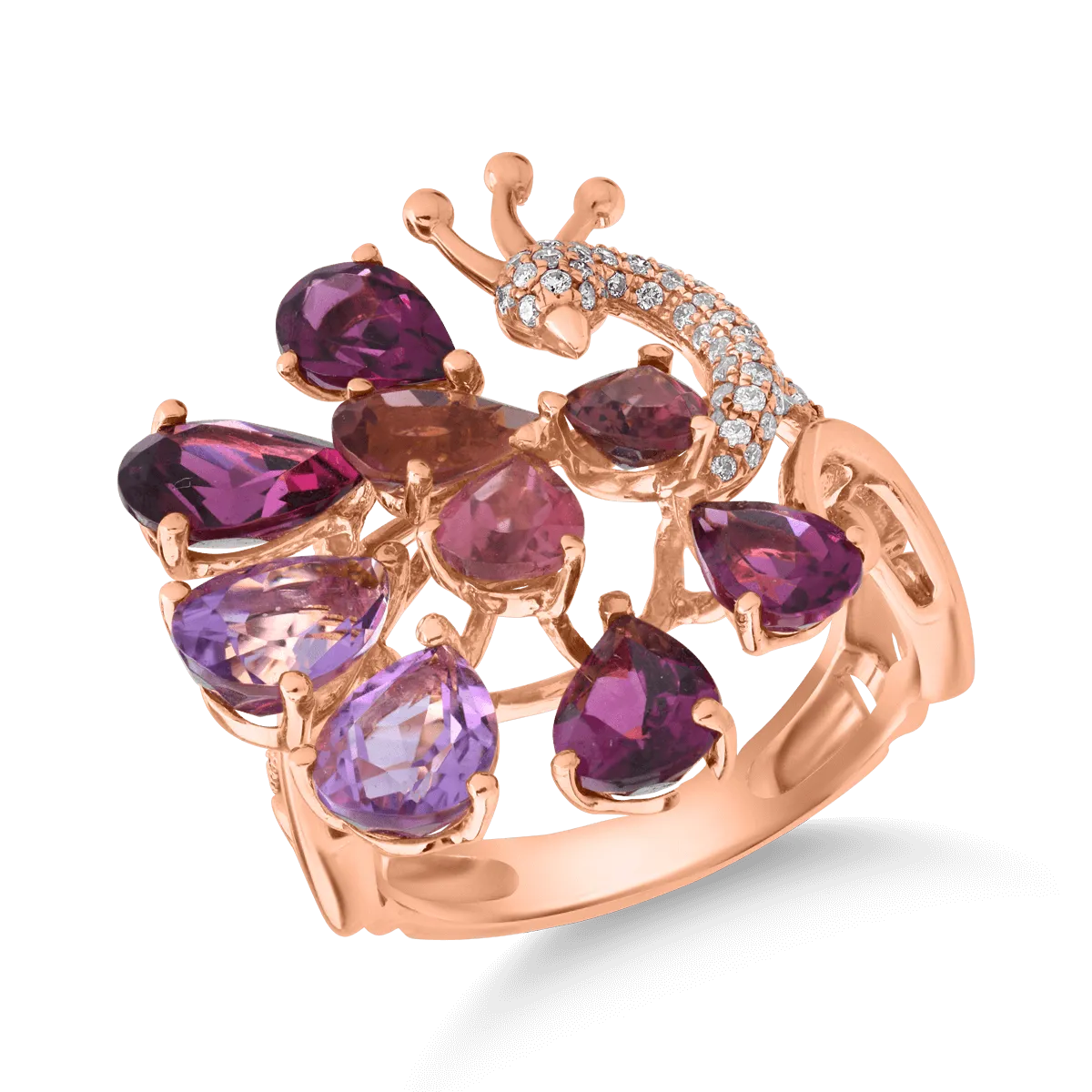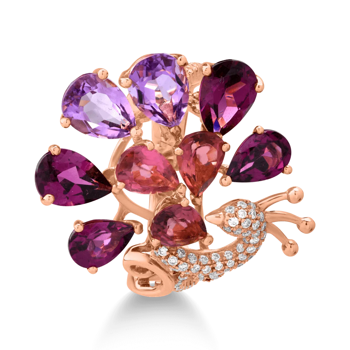 Inel paun din aur roz cu pietre pretioase si semipretioase de 5.78ct