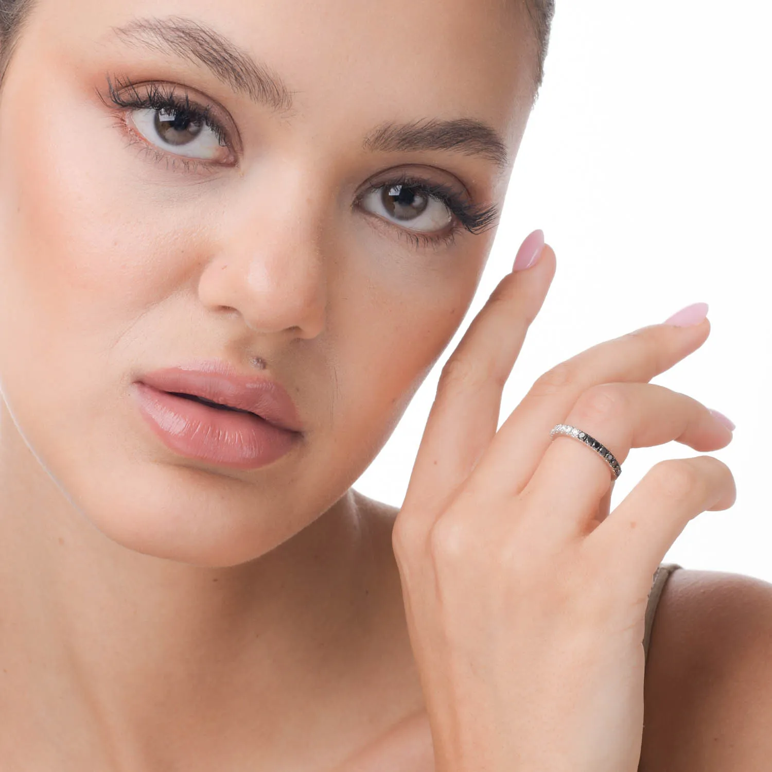 Poarta cu incredere bijuteriile preferate si dezvaluie noi fatete ale feminitatii tale. Un inel semi eternity din aur alb cu diamante incolore si negre de 0.6ct creat din pasiune pentru accesoriile care te fac sa te simti speciala. Intra in lumea seducatoare TEILOR. O lume in care se regasesc cele care adora sa-si depaseasca limitele.