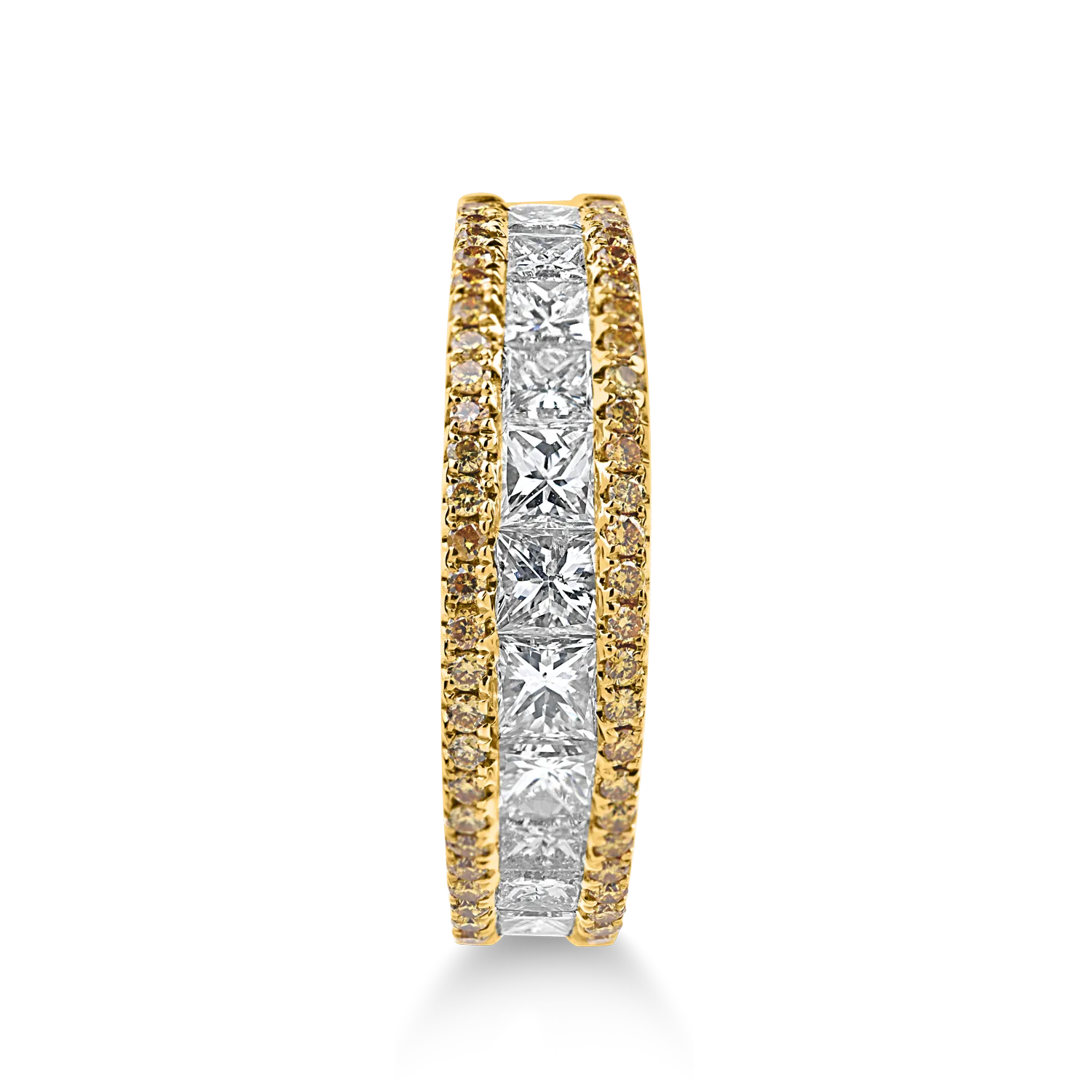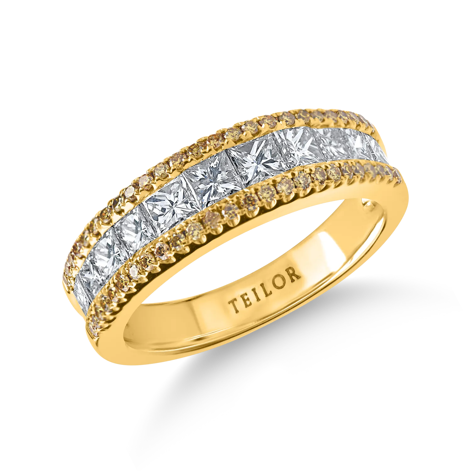 Inel semi-eternity din aur galben cu diamante galbene si diamante incolore princess de 1.4ct