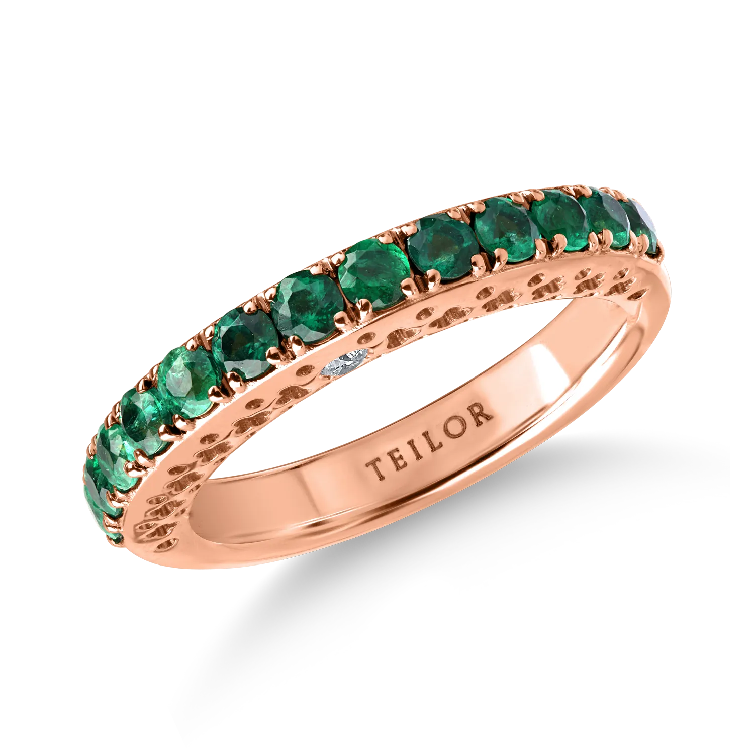 Feminitatea capata noi forme de expresie. Un inel semi eternity din aur roz cu smaralde de 0.7ct si diamante de 0.05ct in care se reflecta dragostea pentru eleganta si rafinament. TEILOR este sinonim cu piesele atemporale, realizate cu precizie desavarsita.