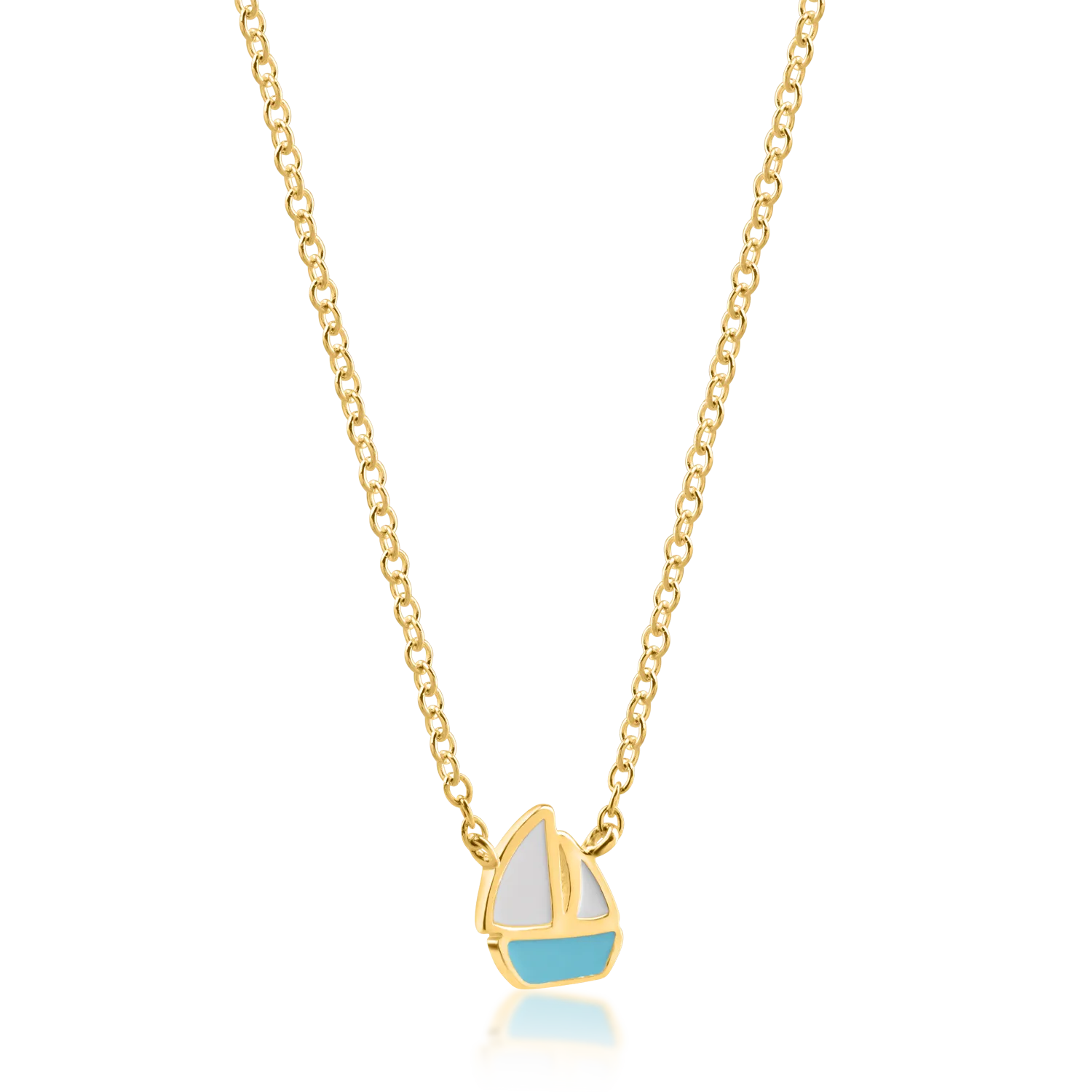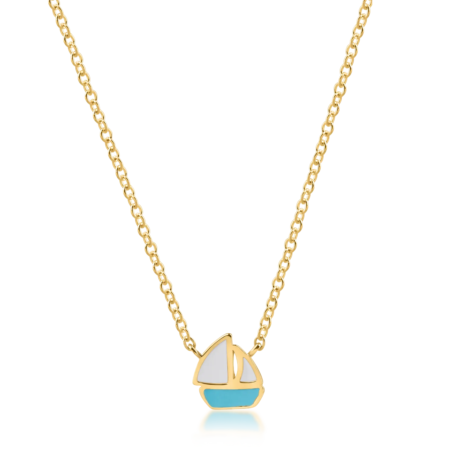 Lant cu pandantiv barca din aur galben cu insertii albe si turcoaz