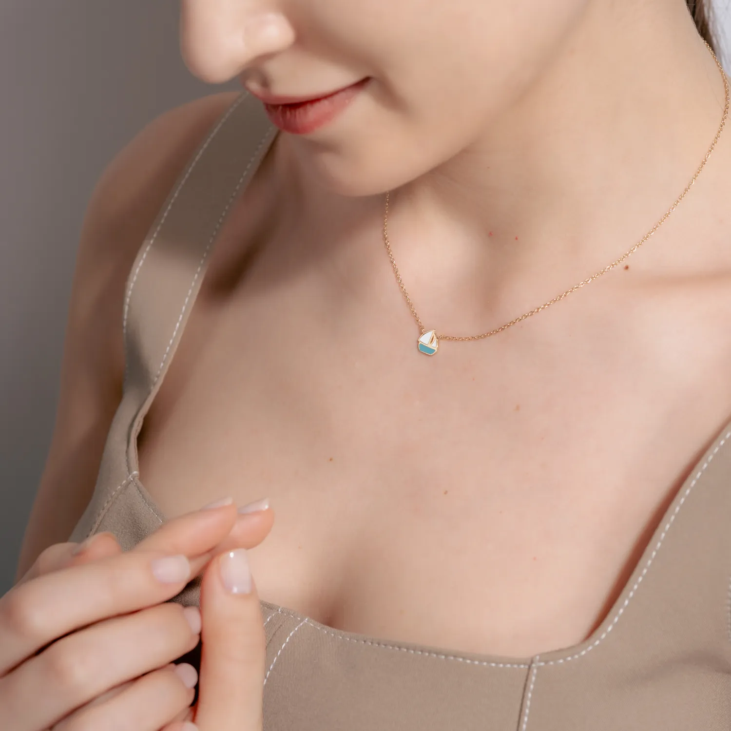 Fii fermecatoare fara prea mult efort. Cu acest lant cu pandantiv barca din aur galben cu insertii albe si turcoaz vei avea acel look demn de revistele de moda. Fii de neuitat cu TEILOR.