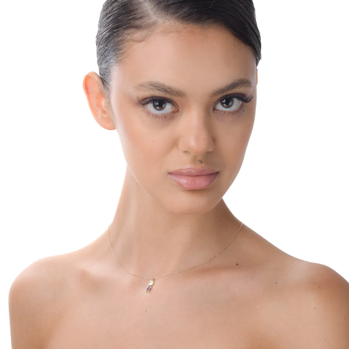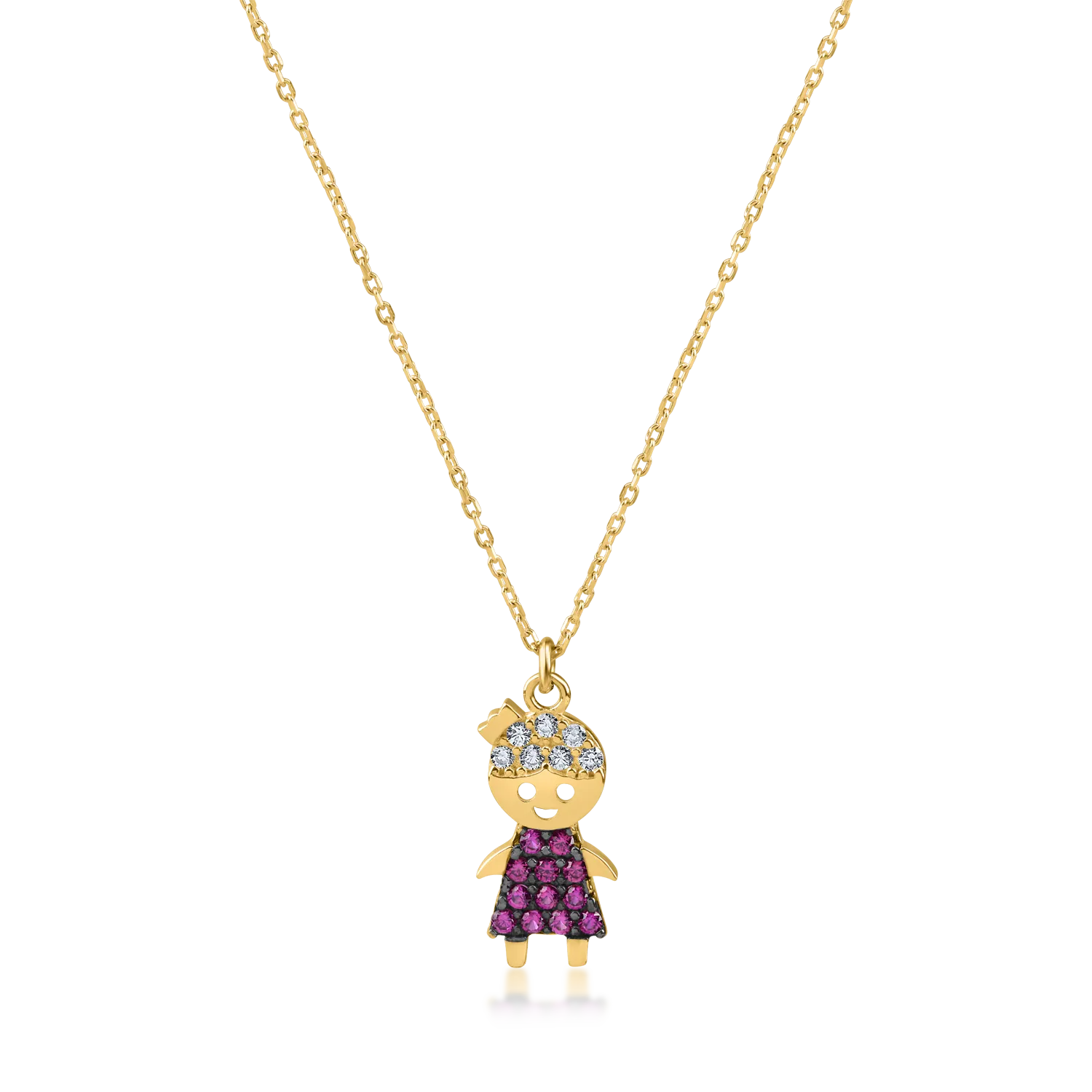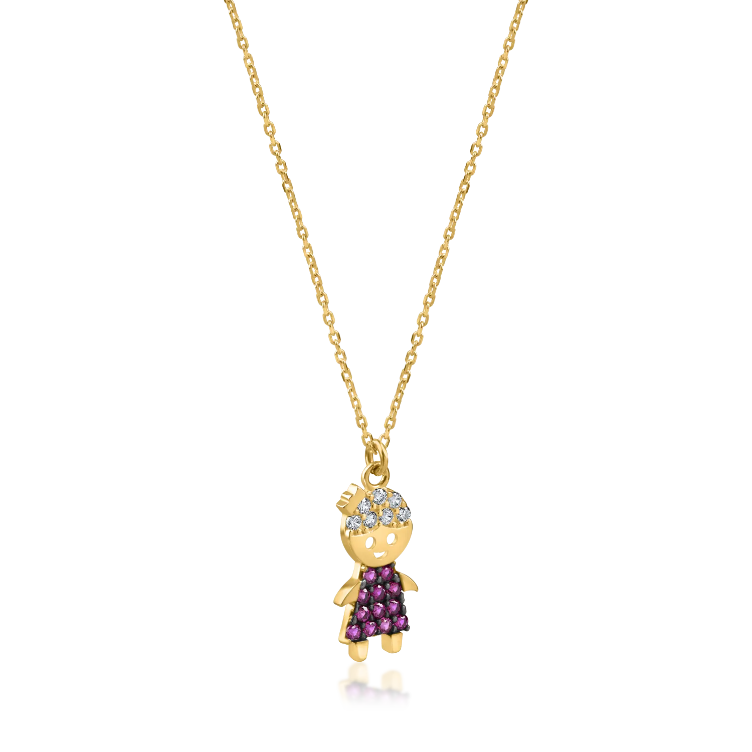 Lant cu pandantiv copil din aur galben cu zirconii roz si albe