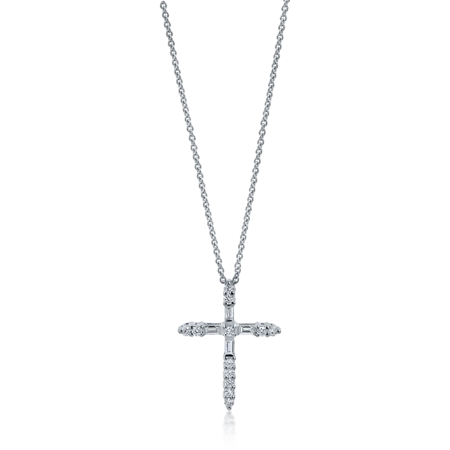Lant cu pandantiv cruce din aur alb cu diamante baguette si rotunde de 0.3ct