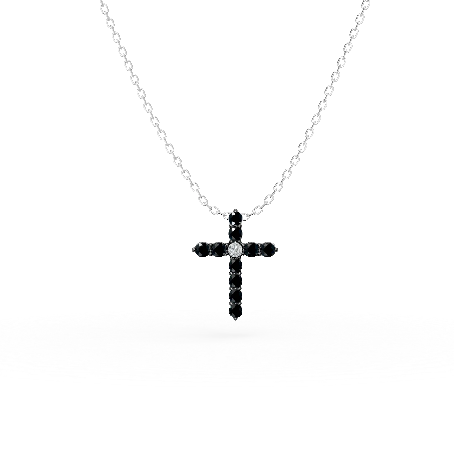 Lant cu pandantiv cruce din aur alb cu diamante incolore de 0.01ct si diamante negre de 0.09ct