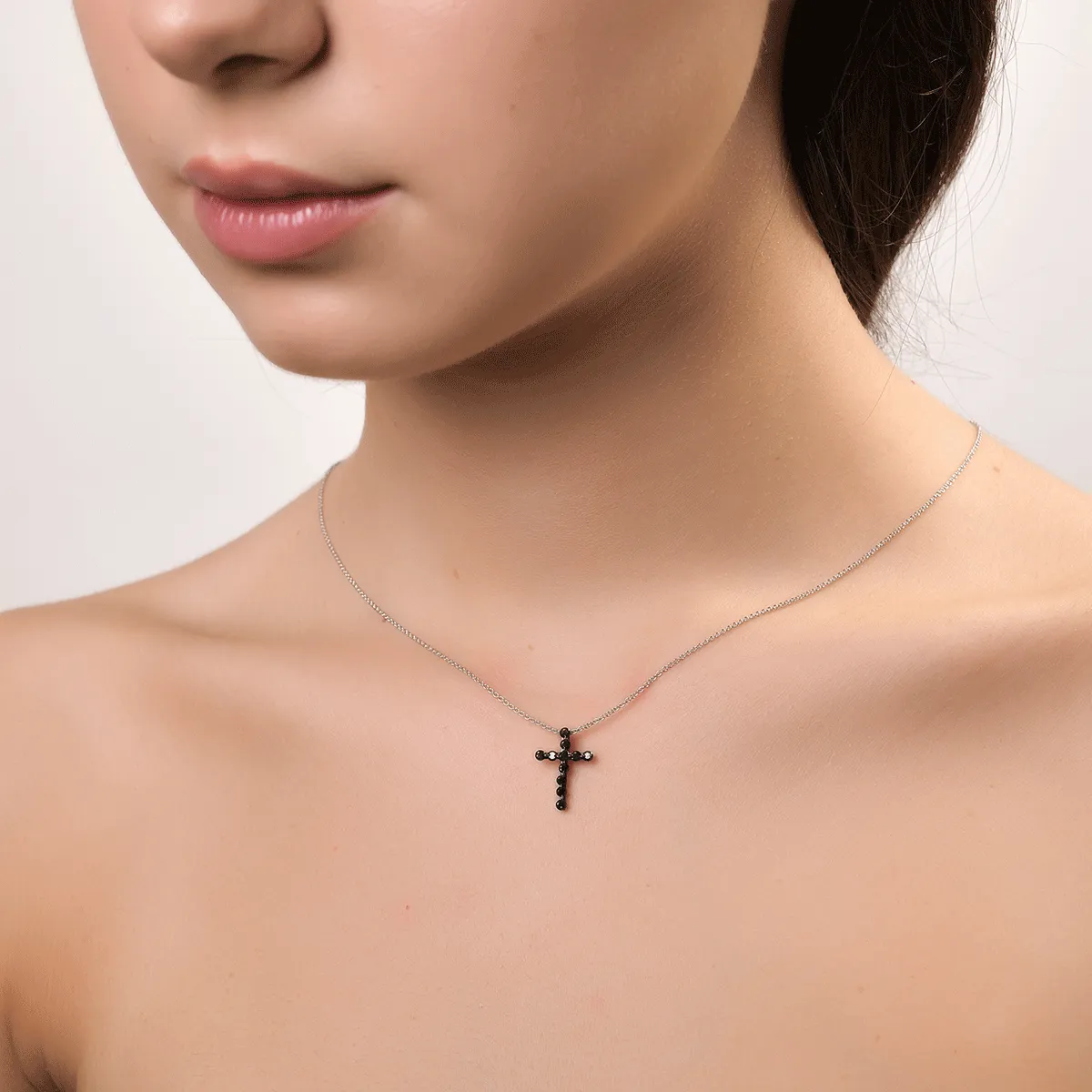 Gratie si frumusete – toate aceste elemente vorbesc despre tine. Lantul cu pandantiv cruce din aur alb cu diamante negre de 0.43ct imbina eleganta minimalista cu misterul nuantelor profunde ale pietrelor. Contrastul dintre stralucirea aurului alb si intensitatea diamantelor negre confera un aer sofisticat si contemporan. Este o bijuterie cu personalitate, perfecta pentru femeia care vrea sa iasa din tipare printr-o nota de rafinament discret. Poarta bijuterii iconice cu TEILOR!