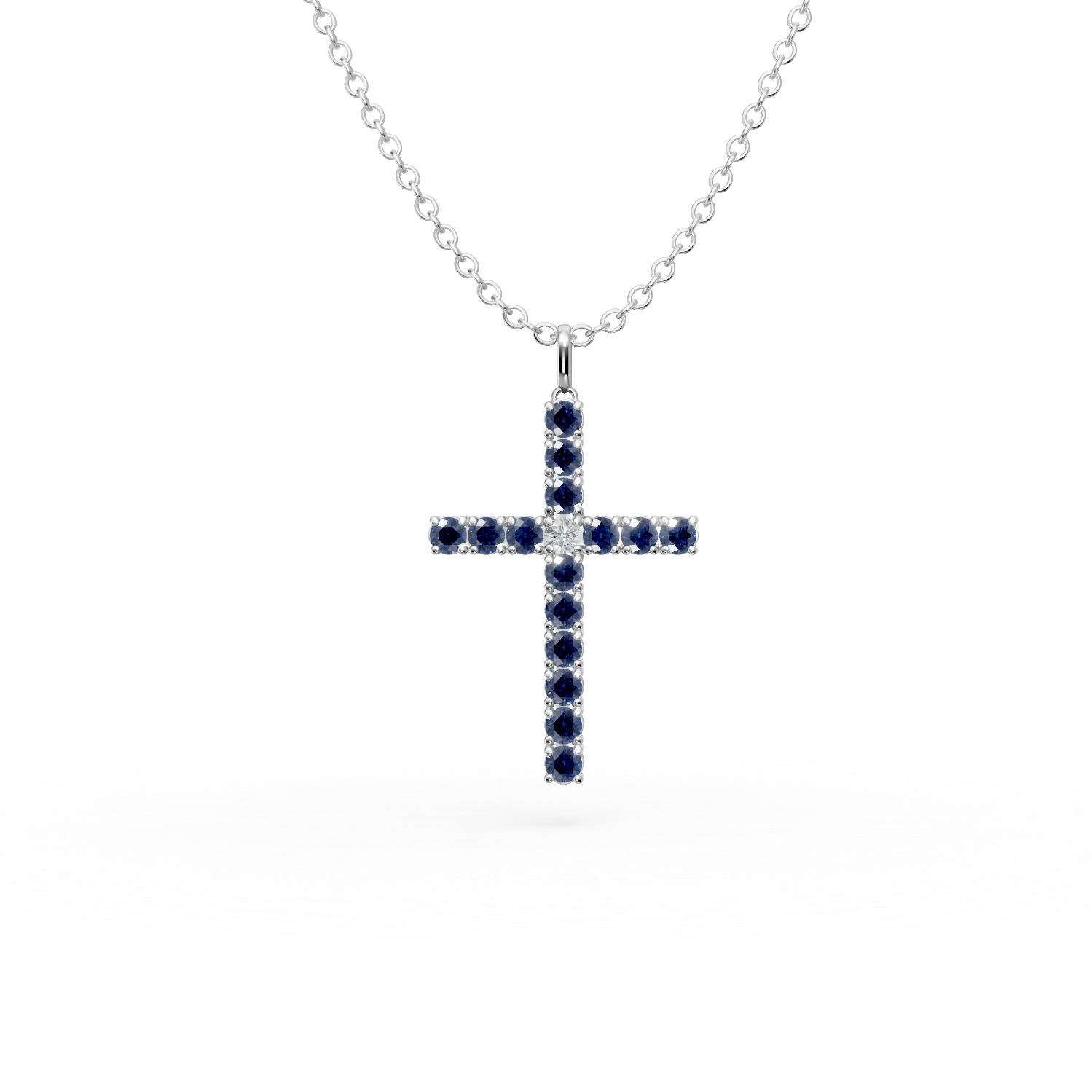 Lant cu pandantiv cruce din aur alb cu safire de 1.2ct si diamant de 0.07ct