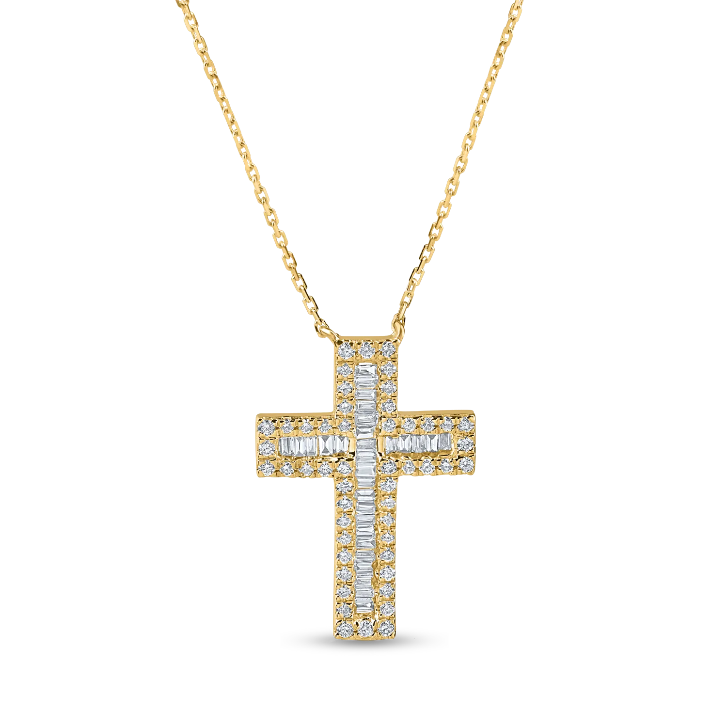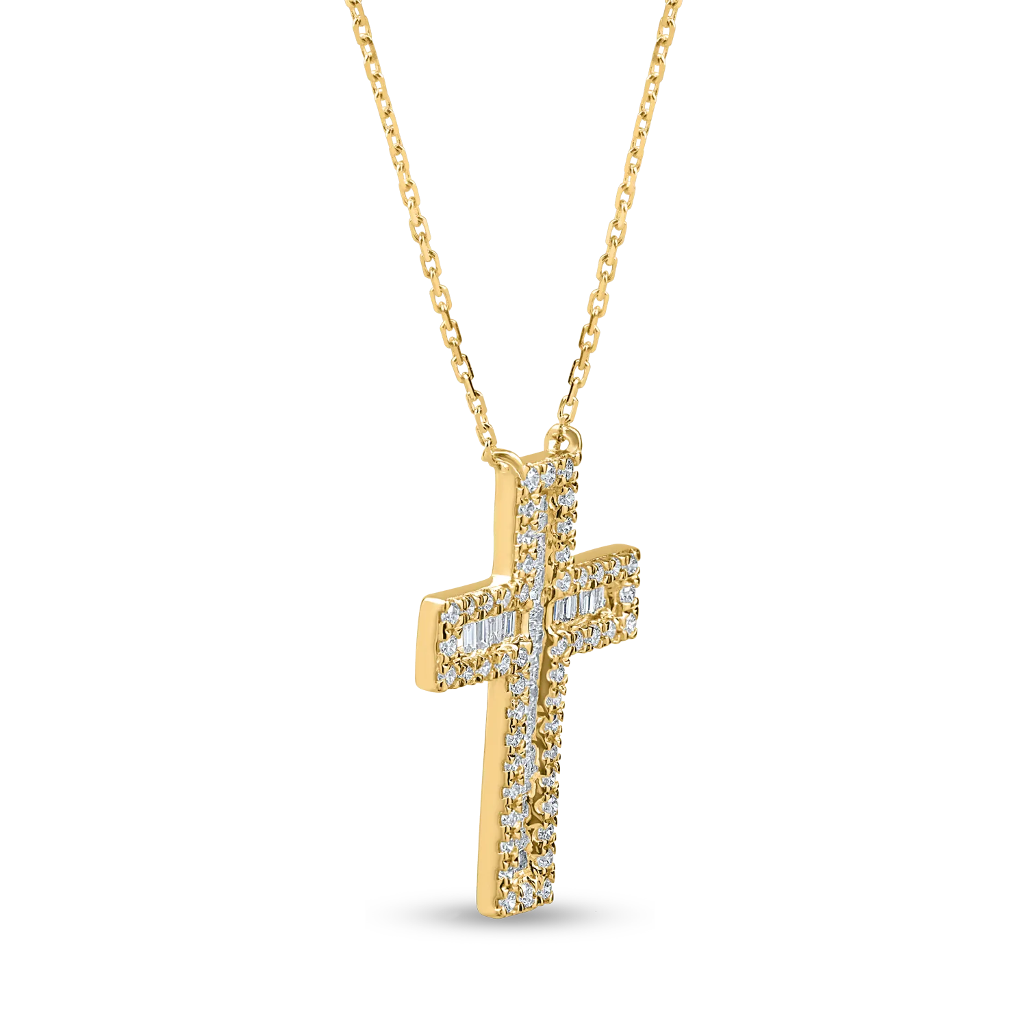 Lant cu pandantiv cruce din aur galben cu diamante baguette si rotunde de 0.4ct