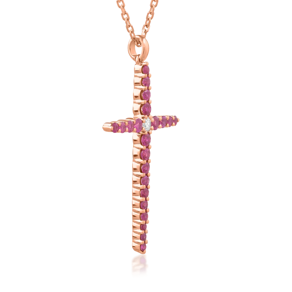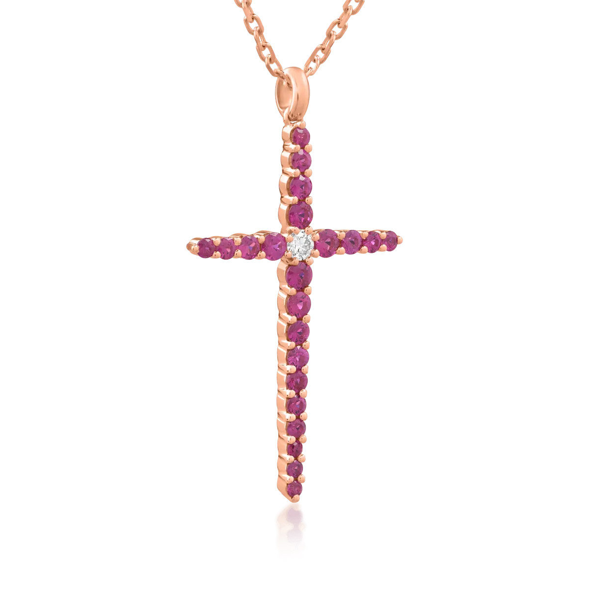Lant cu pandantiv cruce din aur roz cu diamant de 0.09ct si rubine de 1.08ct