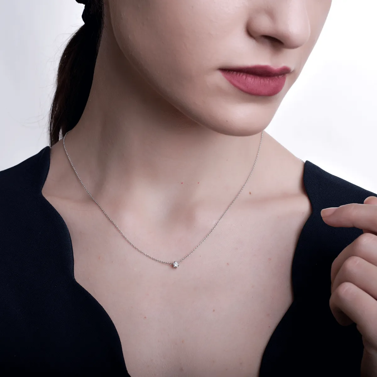 Exploreaza toate fatetele frumusetii. Acest lant cu pandantiv din aur alb cu diamant de 0.14ct poate fi touch-ul final pentru un look fara cusur, ce iti va oferi un plus de incredere in tine. O piesa discreta, dar plina de farmec, care reda esenta elegantei minimaliste. Fiecare detaliu spune o poveste despre rafinament si echilibru, definind perfect stilul tau personal. Fii de neoprit cu bijuteriile TEILOR!